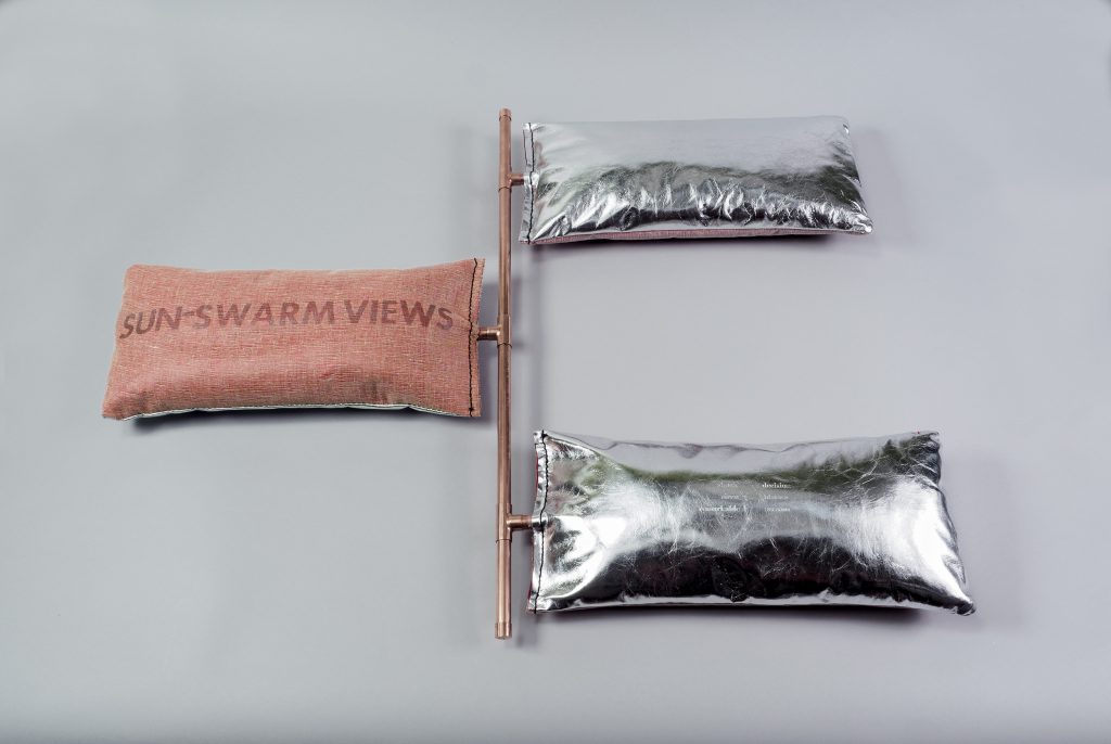 This book object uses poetry, other visual representations of language, and materials to spark that sense of urgency and impossibility that accompanies an emergency. Comprised of three leather pillows bound together with copper pipes, the large ‘E’ asks, How do we continue to pay attention when surrounded by chaos?The pillows are letterpress printed using handset metal type in Shaded Bodoni on the leather and Helvetica woodtype on the crash, then stuffed with raw flax fiber.