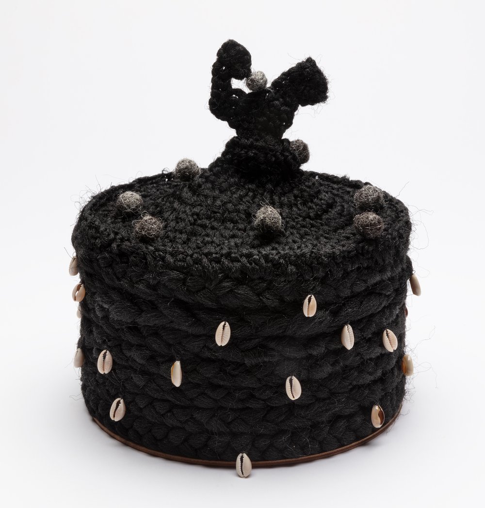 Materials and techniques used in this work were selected for their historical significance, particularly indigo, cowrie, hair, stitching and hair work. The overall form is based on African architecture and African tribal crowns, with the thought of their continued evolution over time and distance. It is also symbolic of a nkisi (minkisi plural), an object containing spiritually charged substances created for protective purposes in west and central Africa. Minkisi creation continued with the enslaved in the US. The bird finial and symbols burned into the base of the book are Adinkra symbols, a system of icons used to communicate proverbs or history, used widely by the Asanti and other peoples of western Africa. Adinkra continue to be used across the African diaspora. The symbols burned into the base at each scent bottle are relevant to the particular chapter headings. The bird symbol is the Sankofa, meaning “go and get it,” encouraging the viewer to look to the past for future guidance.