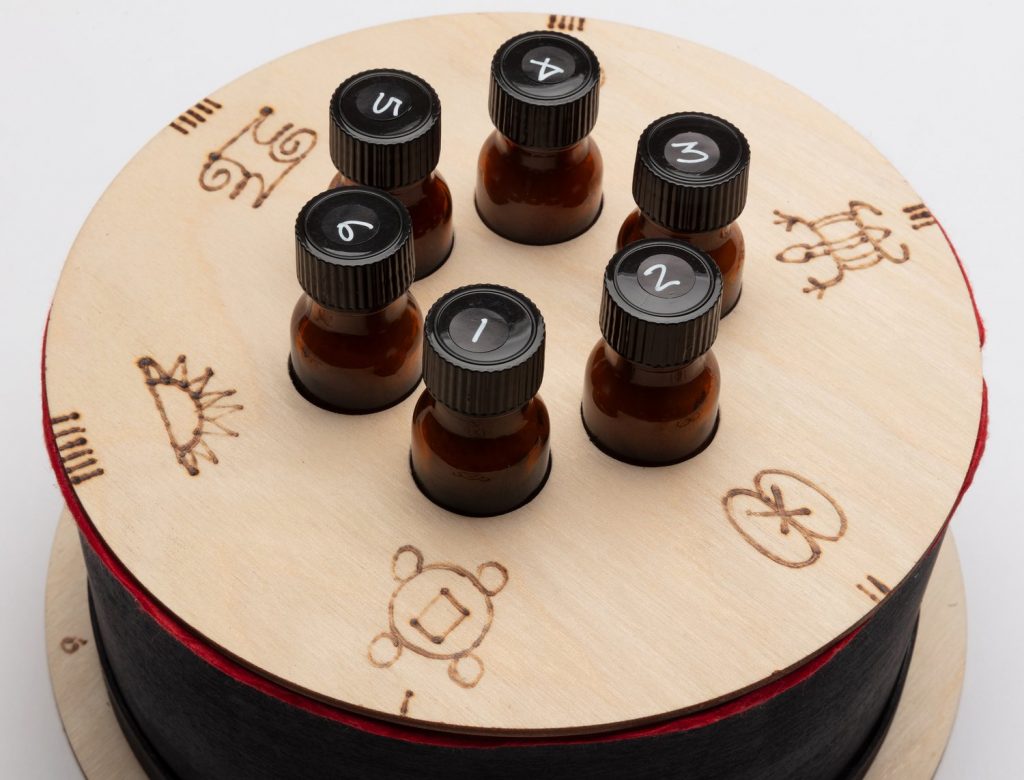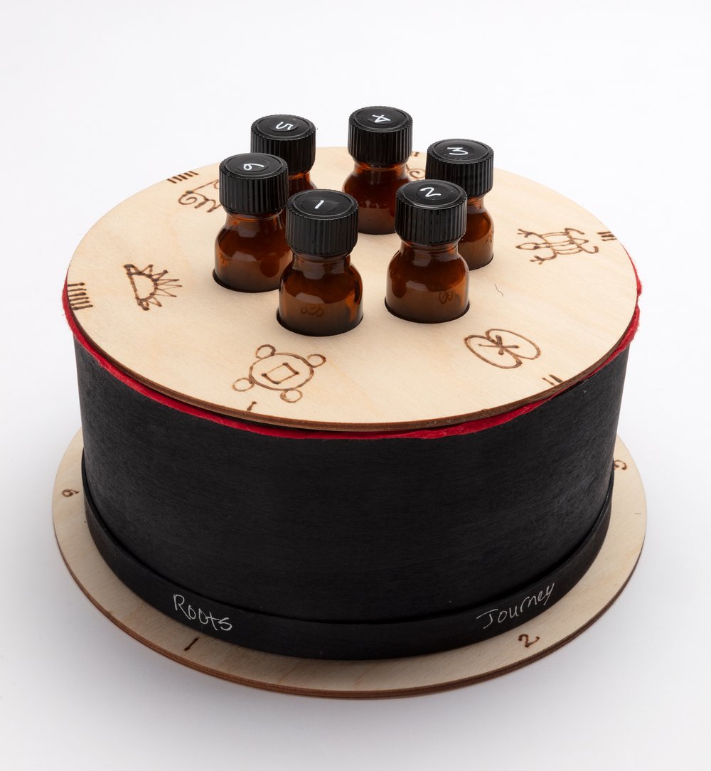 History of a People is an epic that traces the history of African Americans in the US using scent as a charged material. The crown-shaped book consists of six bottles (or chapters) of custom formulated scent that correspond to the cultural landscape of selected periods in African American history: Roots, Journey, Arrival, Harrow, Protest, Visioning. The individual scents mingle to form a singular accord, representing a span of history and the complex layering involved in the creation of a new culture.