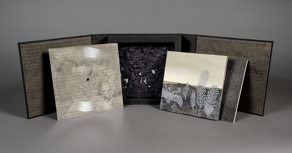 from Cave Paper. The 7-inch record was cut into clear acrylic by LatheCuts in Tucson. In an effort to better integrate the music into the viewing experience, a built-in sound piece containing a sample from the record is triggered when the box is opened. Music was composed at Hawai‘i Volcanoes National Park and recorded at home. Open editions of the content will be made available in alternative formats. This hand-printed and bound, boxed