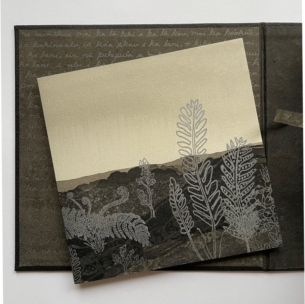 Pilina Everlasting was composed, designed, printed and bound by Allison Leialoha Milham. The text and images were printed on the letterpress from photopolymer plates with added layers of sumi ink washes on Rives Heavyweight and handmade papers. Other papers include abaca from the Morgan Conservatory and cover sheets