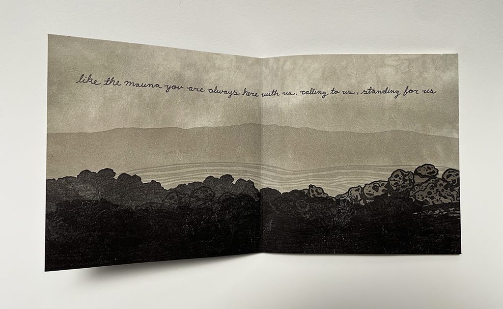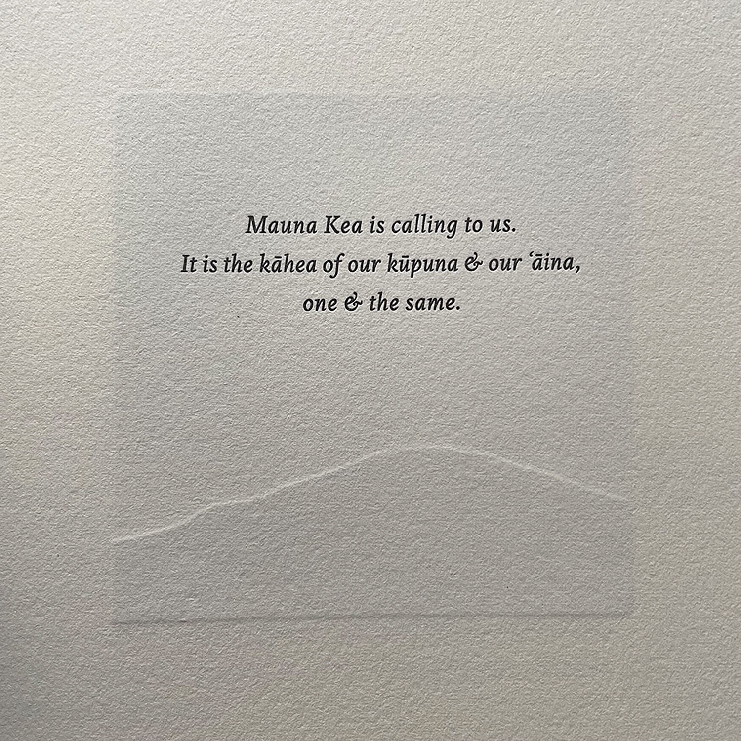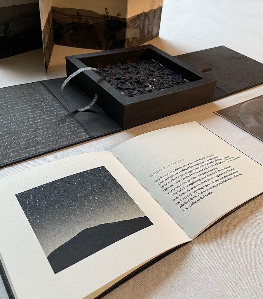 Following my time in Hawai‘i I worked on the text, images and structure in fits and starts at various artist residencies including Paper Machine, In Cahoots and The Press at Colorado College. The printing of Mauna Kea Calling was done during my time as visiting faculty at UA’s Book Arts Program in the winter of 2021. The rest of