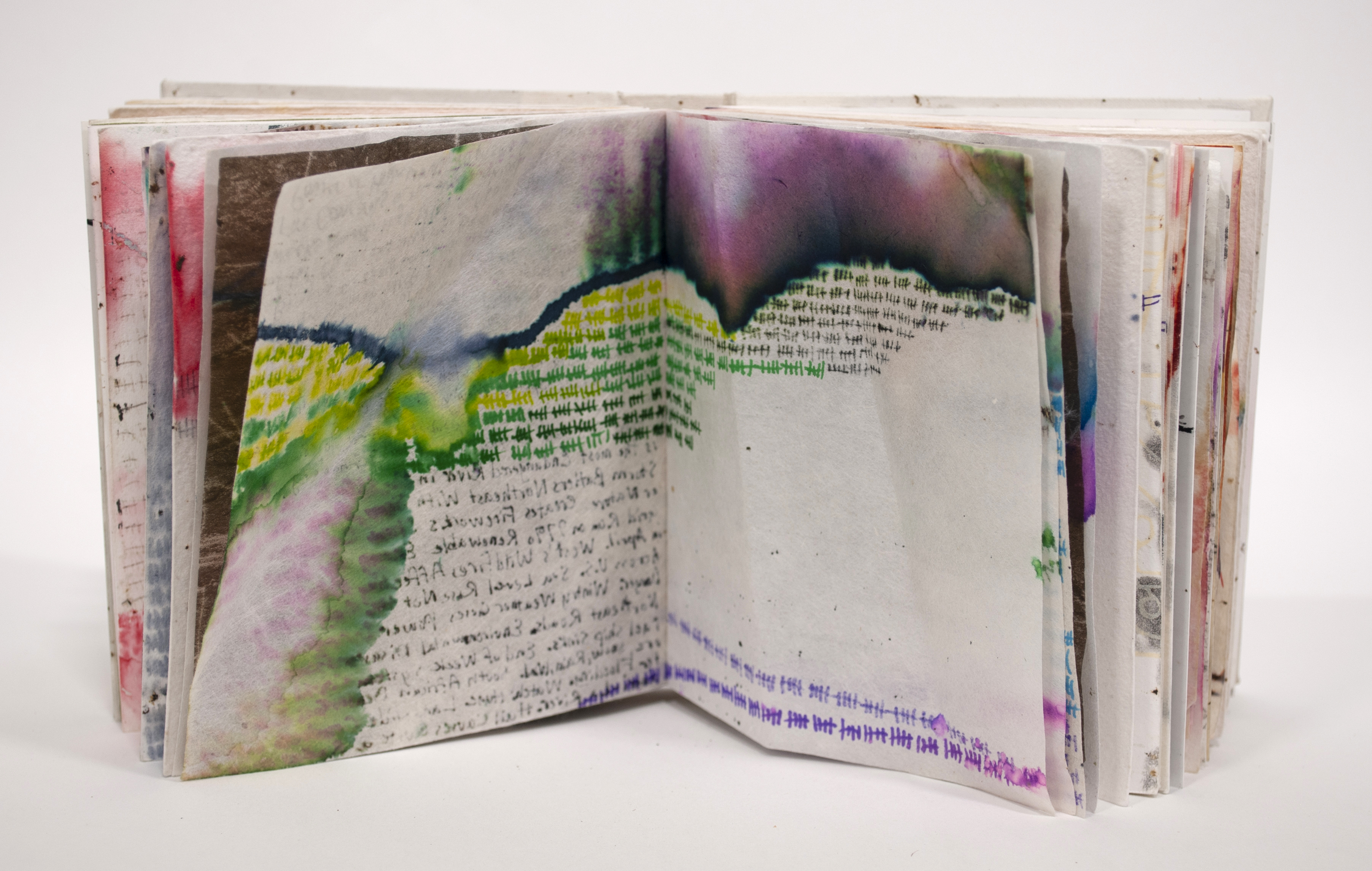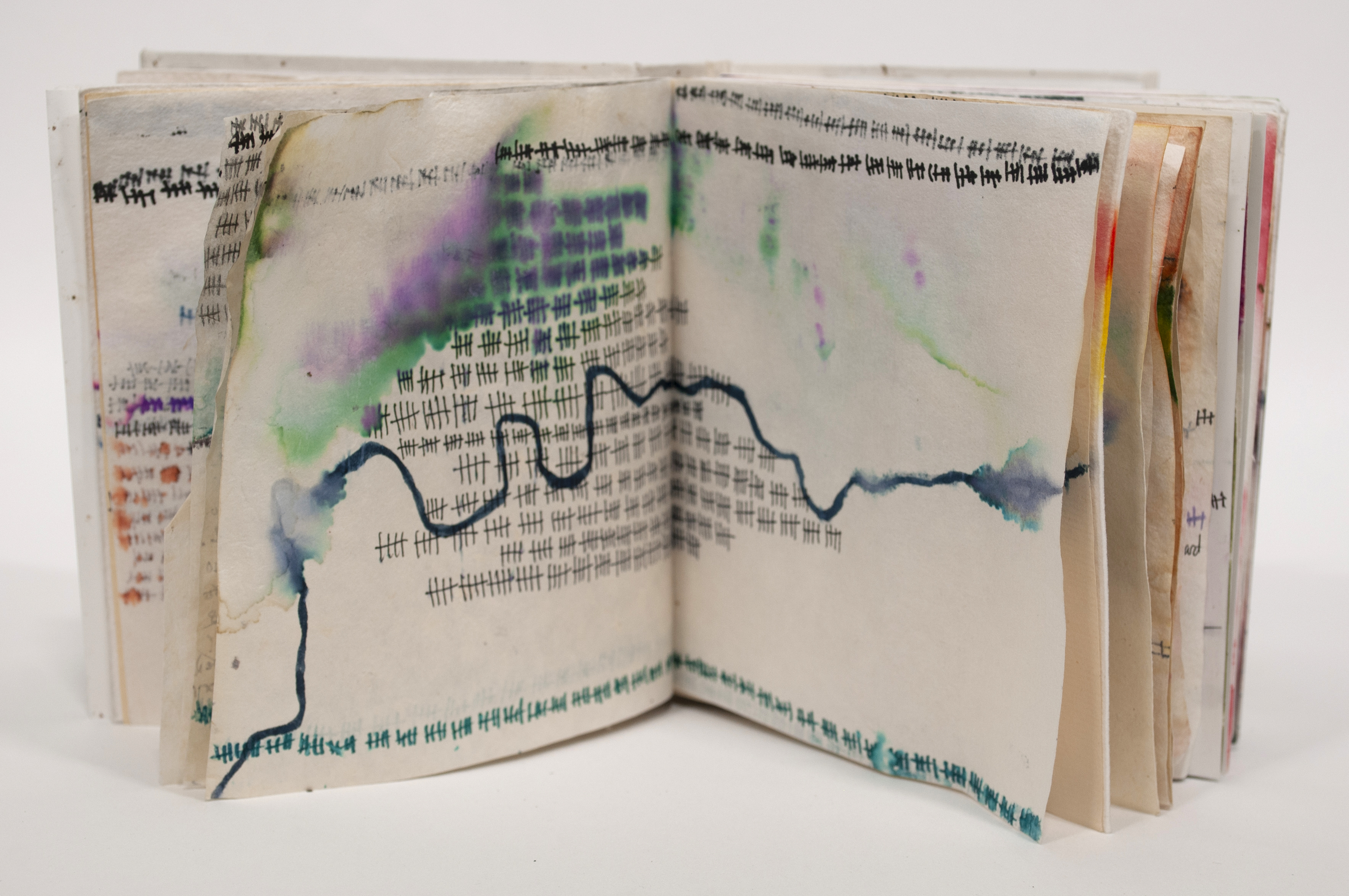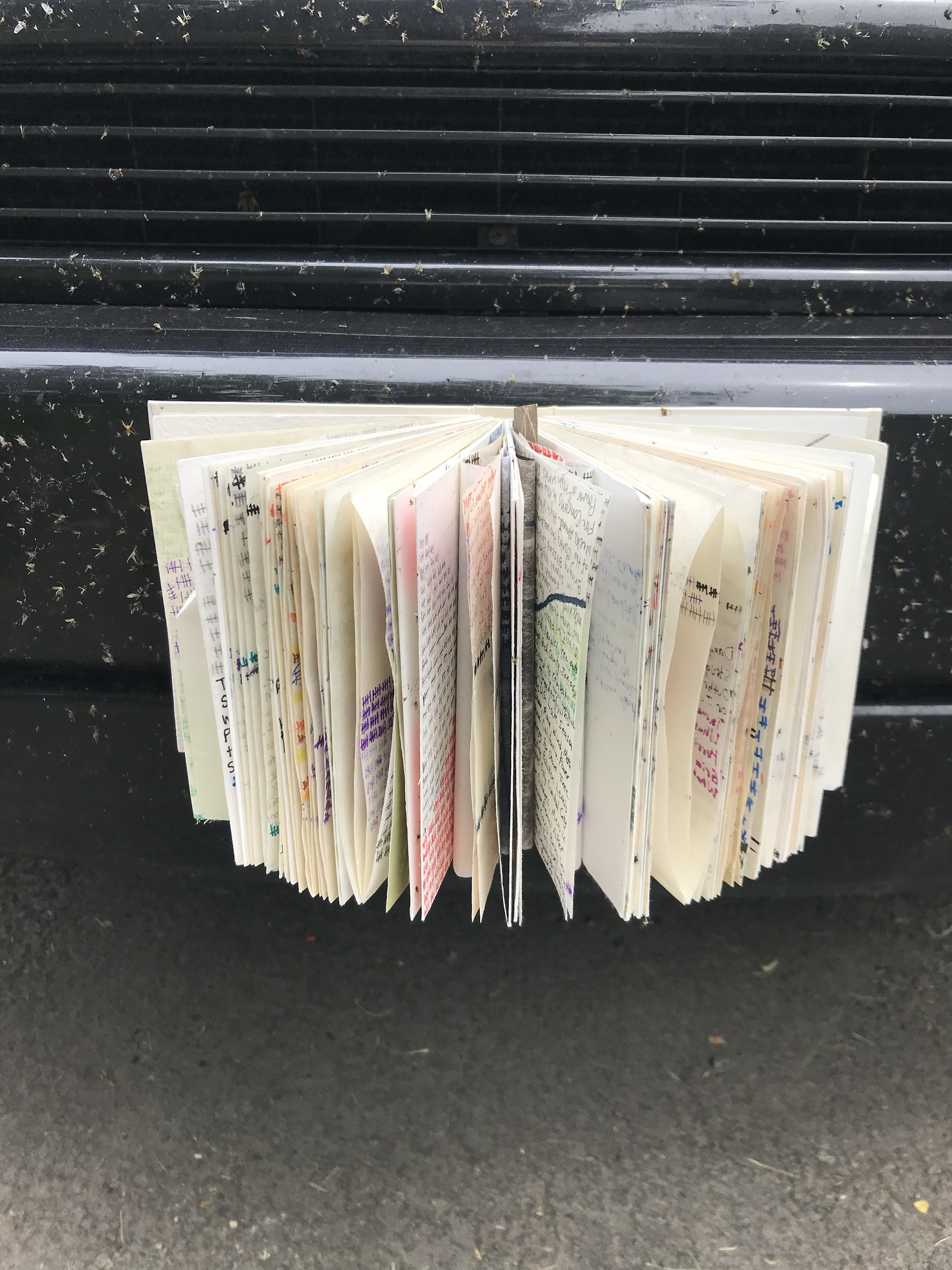 “Book Looking for Rain” is designed and fabricated by Amanda Maciuba using traditional, handmade bookbinding techniques and materials. It features images drawn with a mix of oil-based and water-based media. The original images consist of tally marks (meant to represent the passage of time), roadside fences, headlines from the Weather.com App, roadways and the path of three rivers, The Columbia, Iowa and Connecticut. The book was attached to the front bumper of Kyle Peet’s van, otherwise known as the Ride Share Gallery, from June 16th to August 16th of 2022. The work was intended to change over time depending on the weather it encountered as it traveled around the Pacific Northwest, mostly in Walla Walla, Washington. Accidental encounters with it at the local grocery store or a trailhead by viewers was meant to encourage critical contemplation of the ever-increasing extreme weather events throughout the United States that are exacerbated by human-caused climate change. The final result is a collaboration between Maciuba, Peets and the local weather encountered by the book while affixed to Peet’s van (The Ride Share Gallery), in the mostly drought-starved Pacific Northwest in the Summer of 2022.