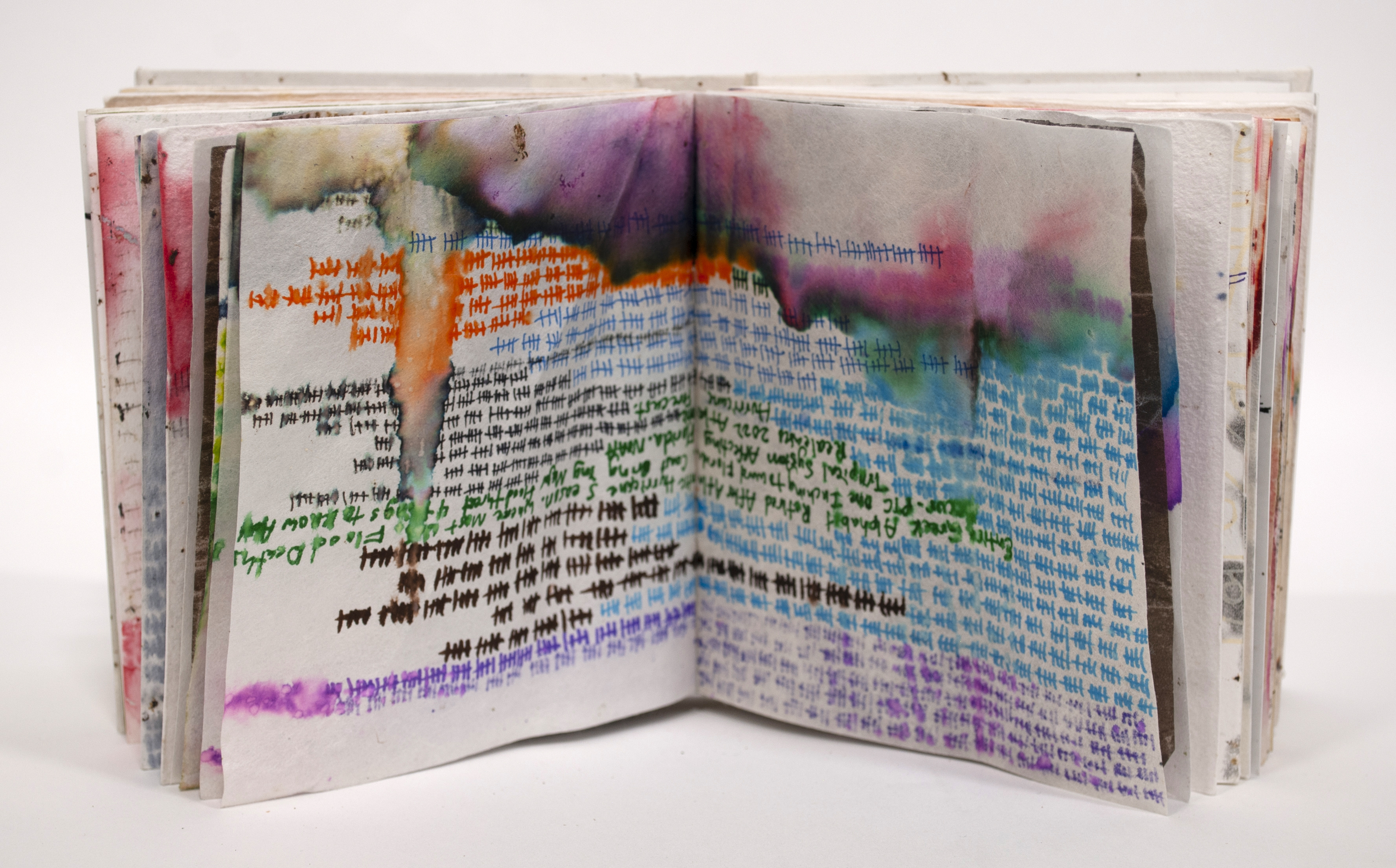 Casebound artist’s book, Oil-based & regular Sharpie, graphite, ballpoint pen, crayola fine point markers, & ink on mixed paper (includes handmade abaca, kozo, cotton, flax) and yupo