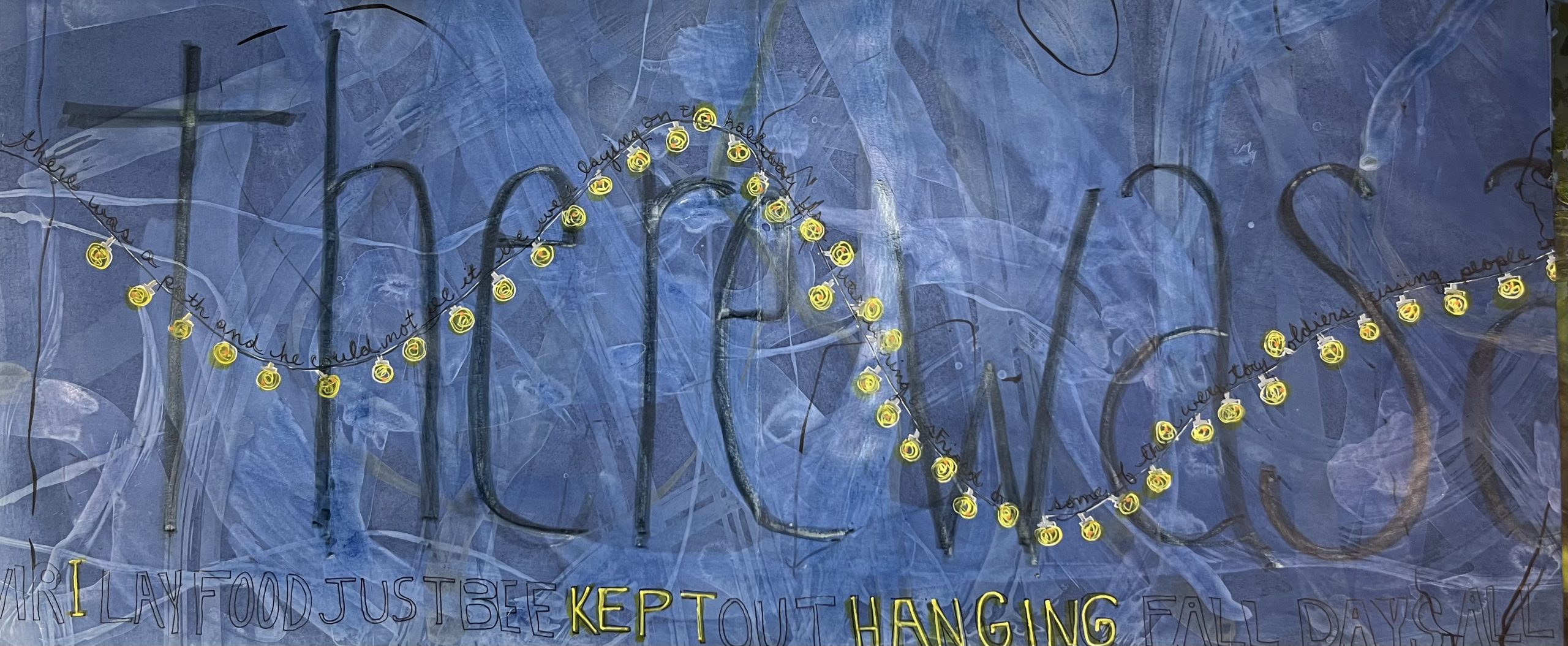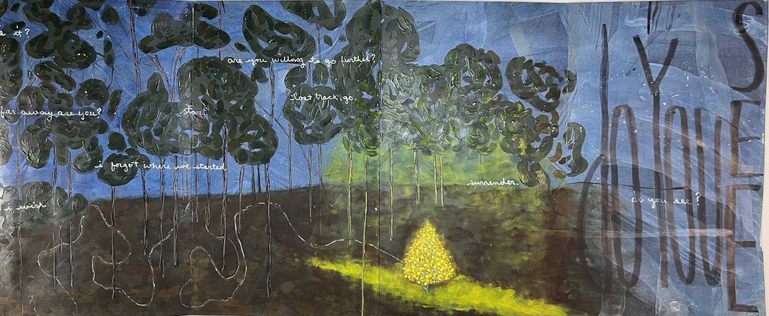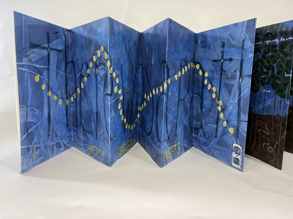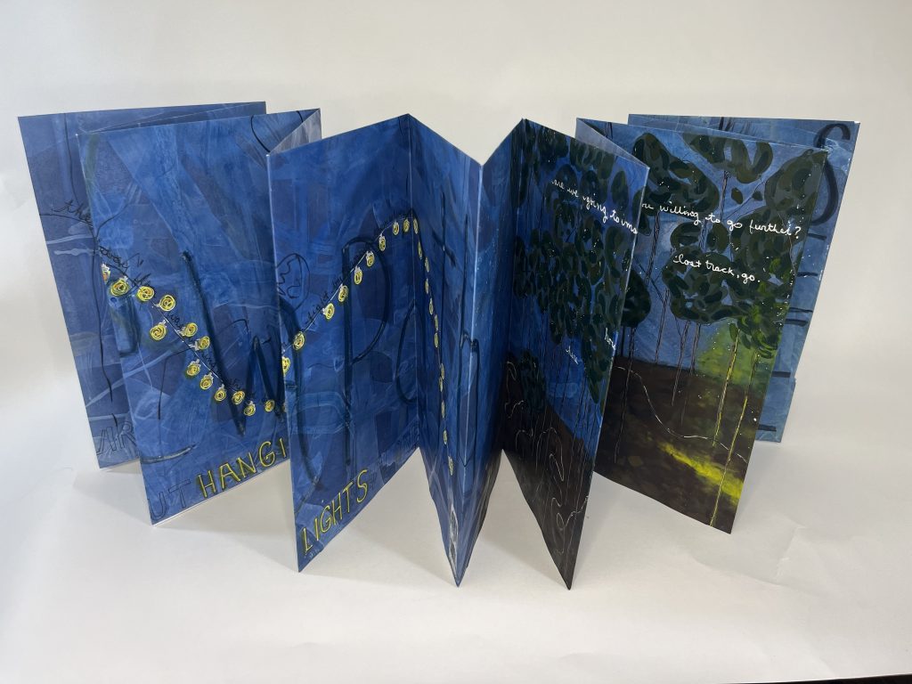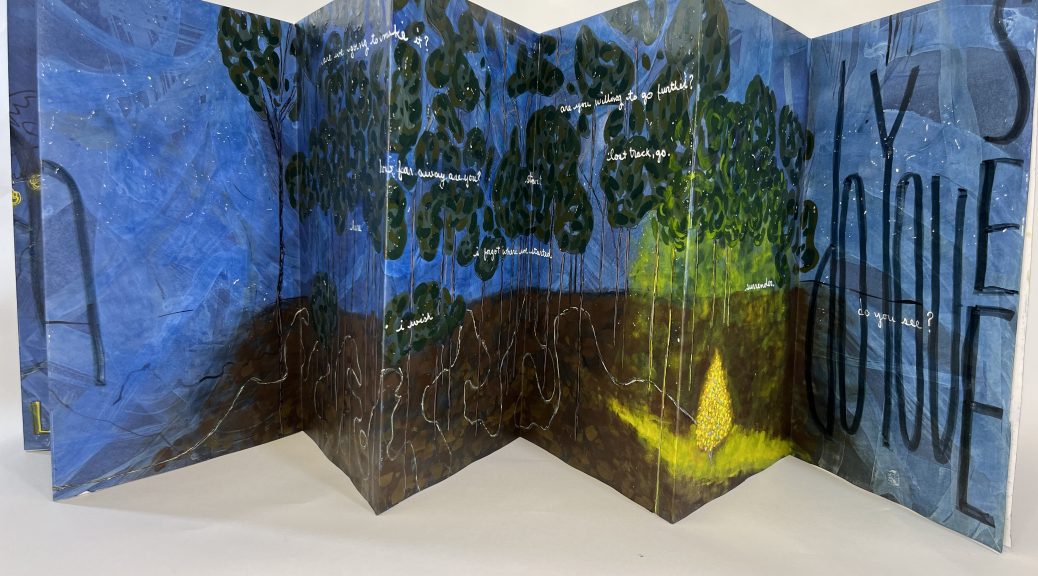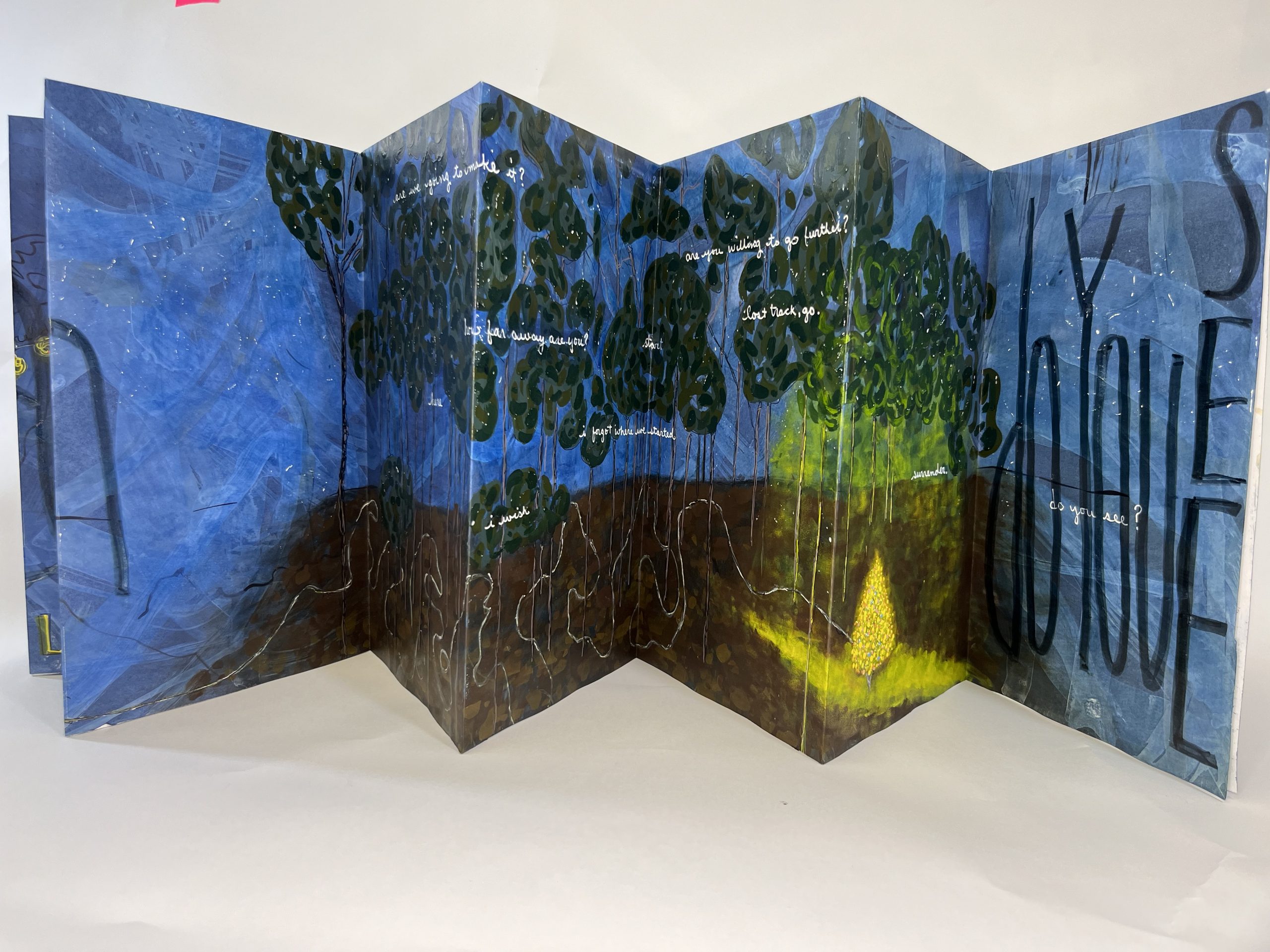 I fold large scale paintings into book forms. Folding generates unexpected breaks and reveals new forms in the paintings. This piece stems from dreams and becoming aware of when I have strayed. The book unfolds and folds in the direction that the viewer chooses, the dream-telling is nonlinear. I make books to explore what is felt and what isn’t felt, what is truth and what is imagined, when to rise and when to dream.