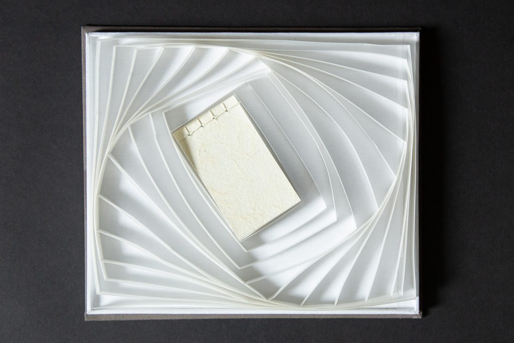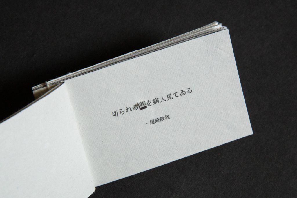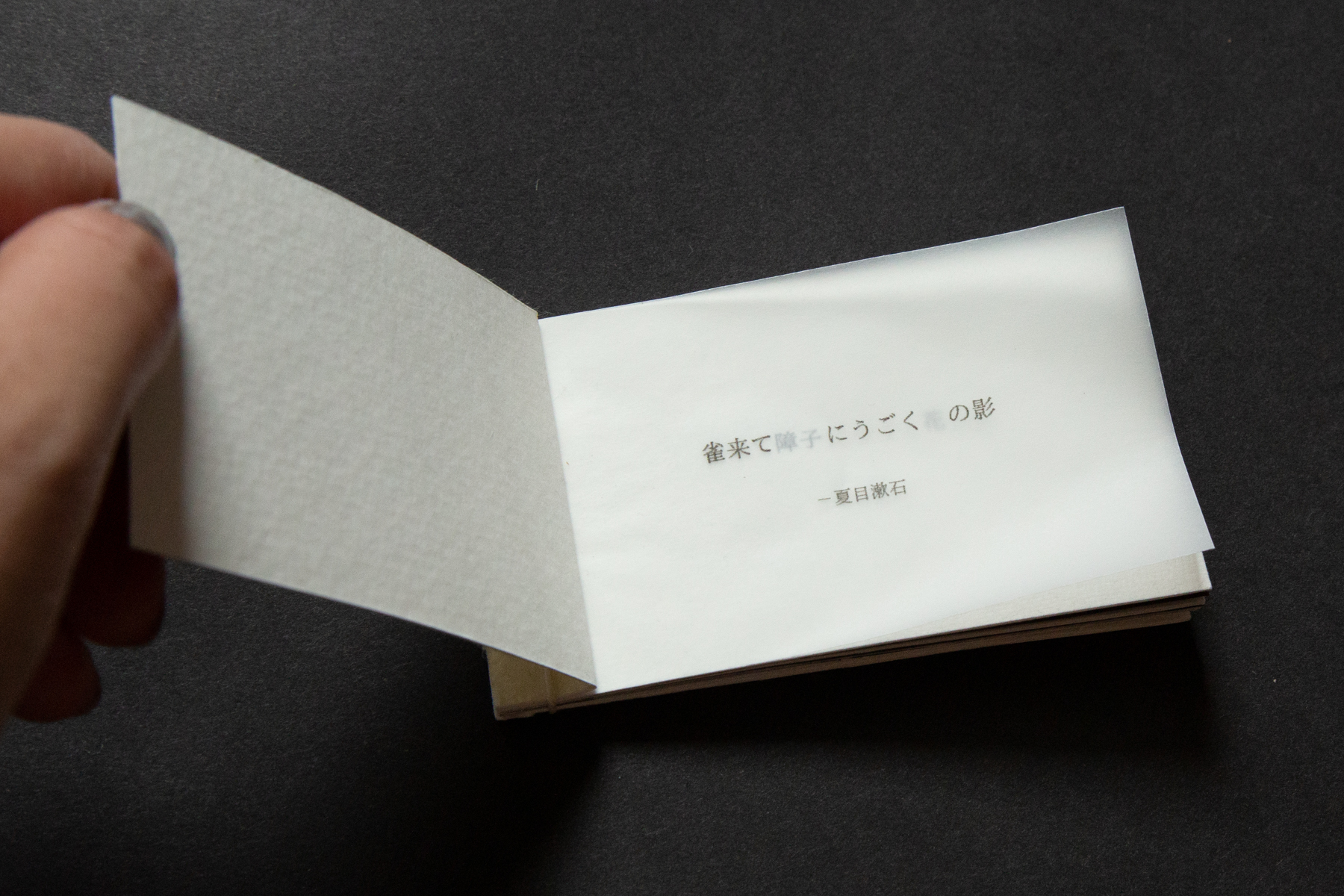 The smaller inner book communicates features and aspects of Japanese haikus that I am drawn to, one being kireji (切れ字), which translates literally to “cutting word.” Traditionally, Japanese haikus are written in one continuous line. Thus, kireji are crucial verbal exclamations that punctuate and emphasize the end of a haiku section. Masterful use of kireji creates an intuitive literary rhythm that very naturally “cuts space” in the haiku.