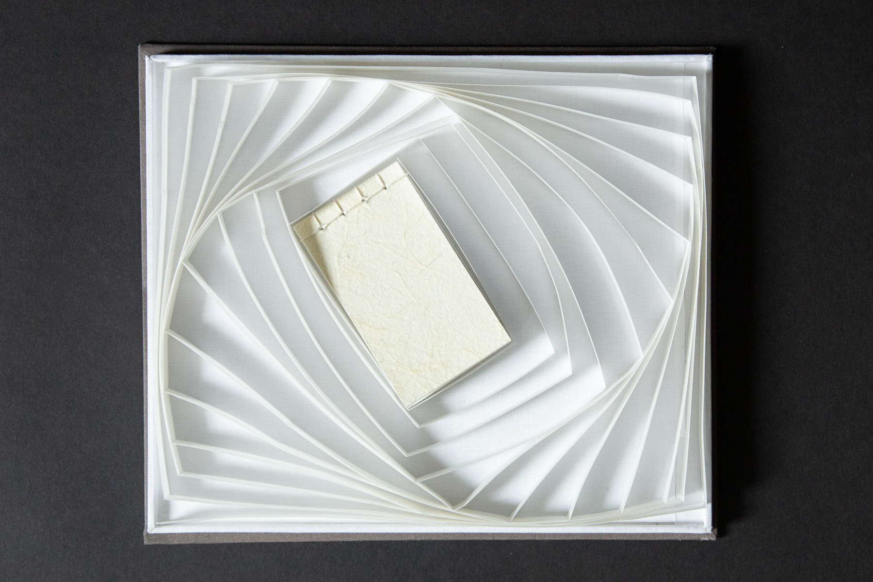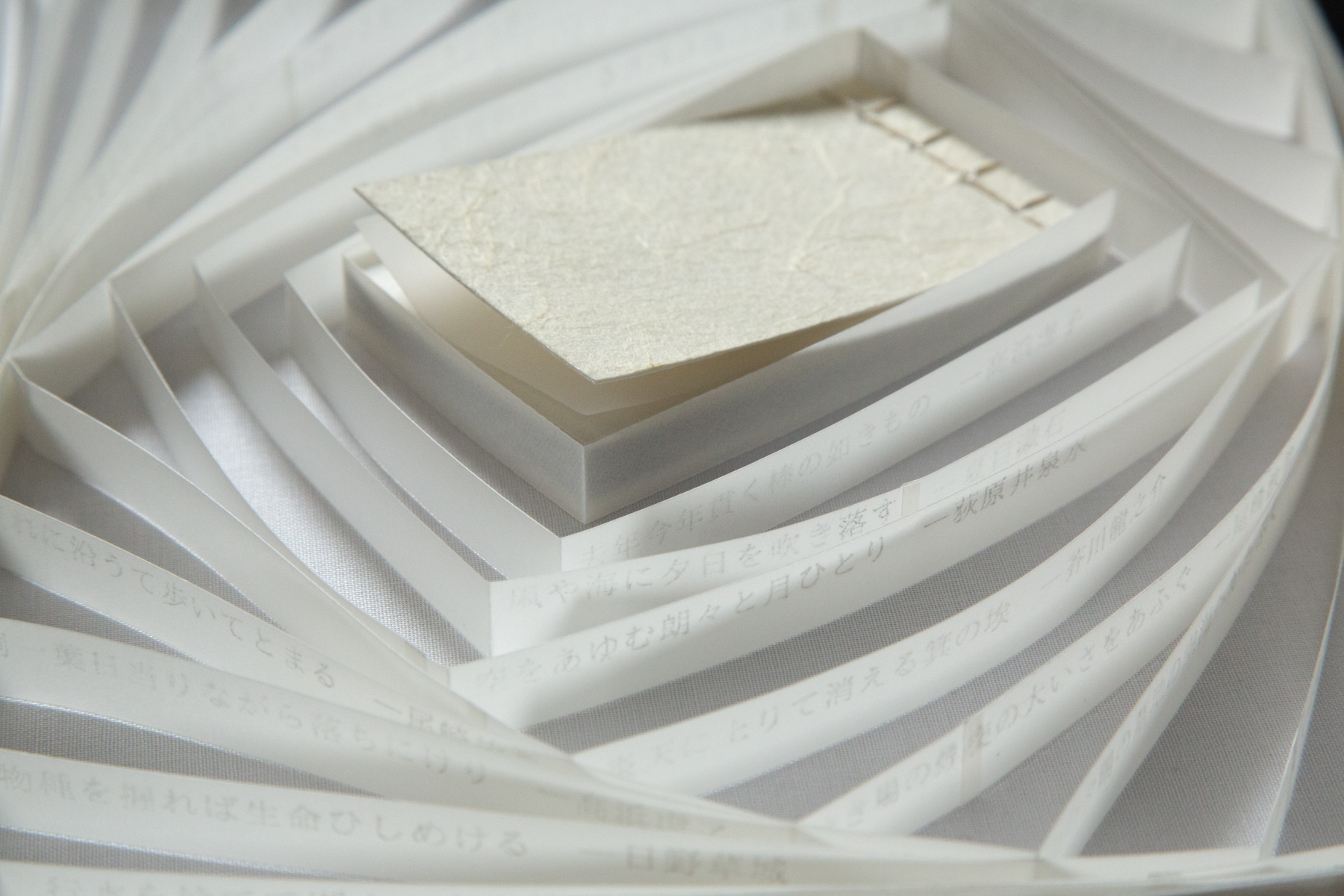 The spiral shape of the outer book takes inspiration from one specific haiku, which is the first one on the strip: 巻貝の渦ゆきわたる冬銀河 (makigai no uzu yukiwataru fuyu ginga). Written by Hanatani Kazuko, this haiku can be roughly translated to “conch shell’s / spiraling / winter galaxy,” likening the spiral of a conch shell to that of the Milky Way.