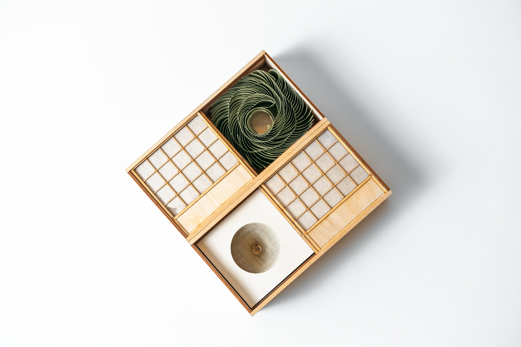 「俳句の箱庭」(Garden of Haikus) conveys the experience and sensation of reading a Japanese haiku—its nuances, atmospheric quality, and revelatory potential. The box component features fully functioning shōji doors. Each of these sliding doors opens up to one book.