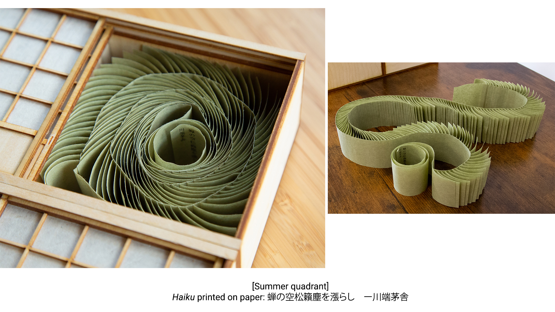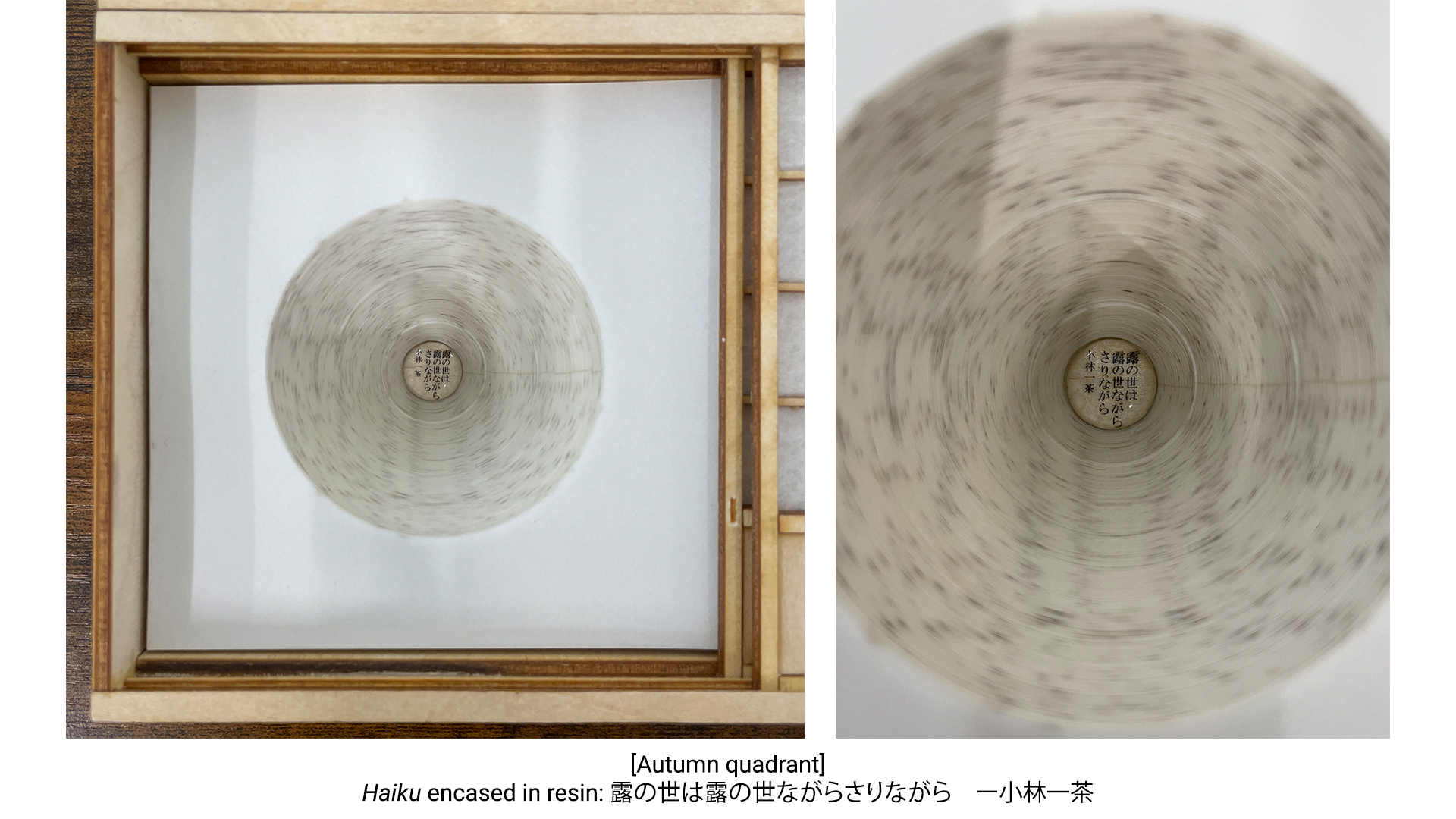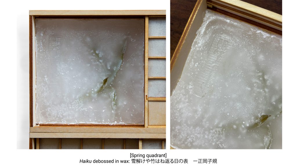 The seasons play an integral role in Japanese haiku tradition, with specific kigo (季語, literally translating to ‘season word’) corresponding to particular seasons. When one identifies a kigo in a haiku, one will know which season the haiku is speaking to. To emphasise this crucial feature, I crafted one compartment for each season. Each compartment houses one book and each book portrays one haiku.