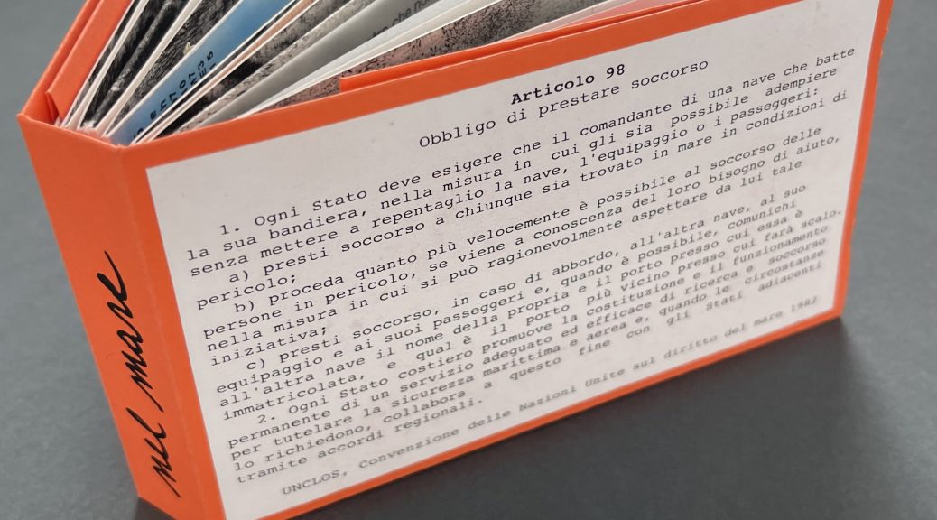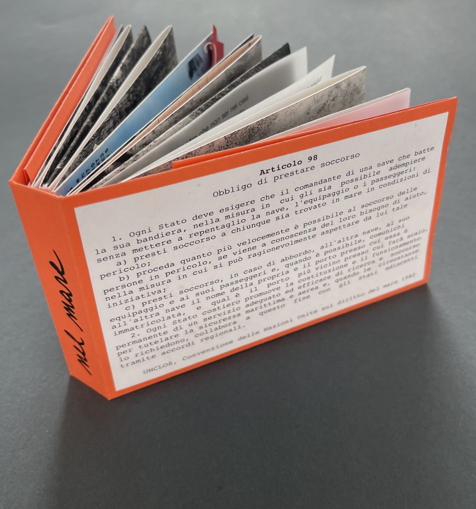 My book is dedicated to all the human beings who lost their lives in the desperate attempt to cross the Mediterranean Sea with makeshift boats and were unable to reach Europe, in the hope of starting a life without wars, famines and violence of every type. It is a silent book, it contains only a poem by the great Italian writer Erri de Luca “Our sea that you are not in the skies”, while on the cover there is article 98 of the UNCLOS and on the back cover article 10 of the Italian Constitution concerning the rights of refugees.