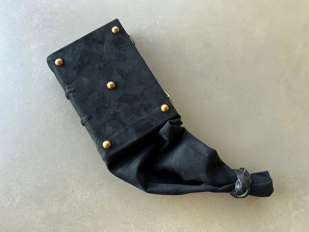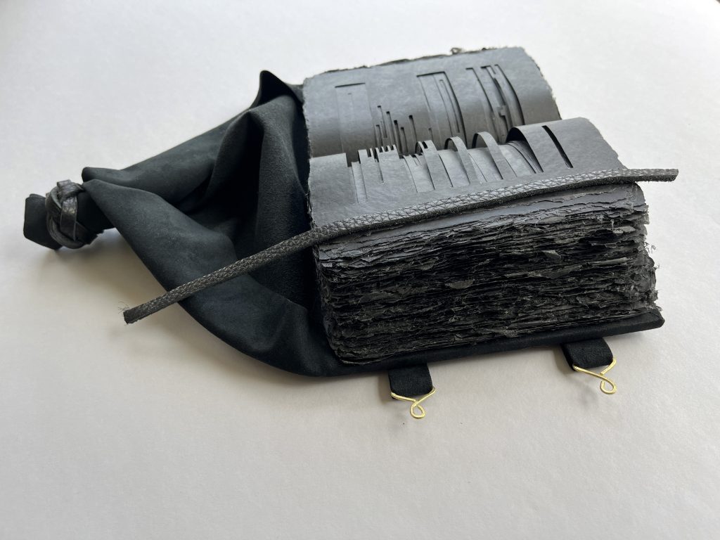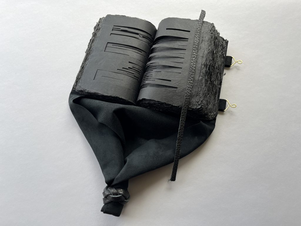 Bound as a Medieval girdle book, this work muddles an already murky separation of church and state. While historically these portable volumes often contained religious scripture, “In the Dark” uses governmental reporting to critique how politics have become religion for an expanding demographic. In this book, darkness and light contradict their known meanings. Excised redactions illuminate what has been concealed, leaving behind the literal shreds of evidence. Worn at the waist to always be close at hand, this girdle book structure serves as an ever present reminder to the burden of obstruction of justice on the body politic.