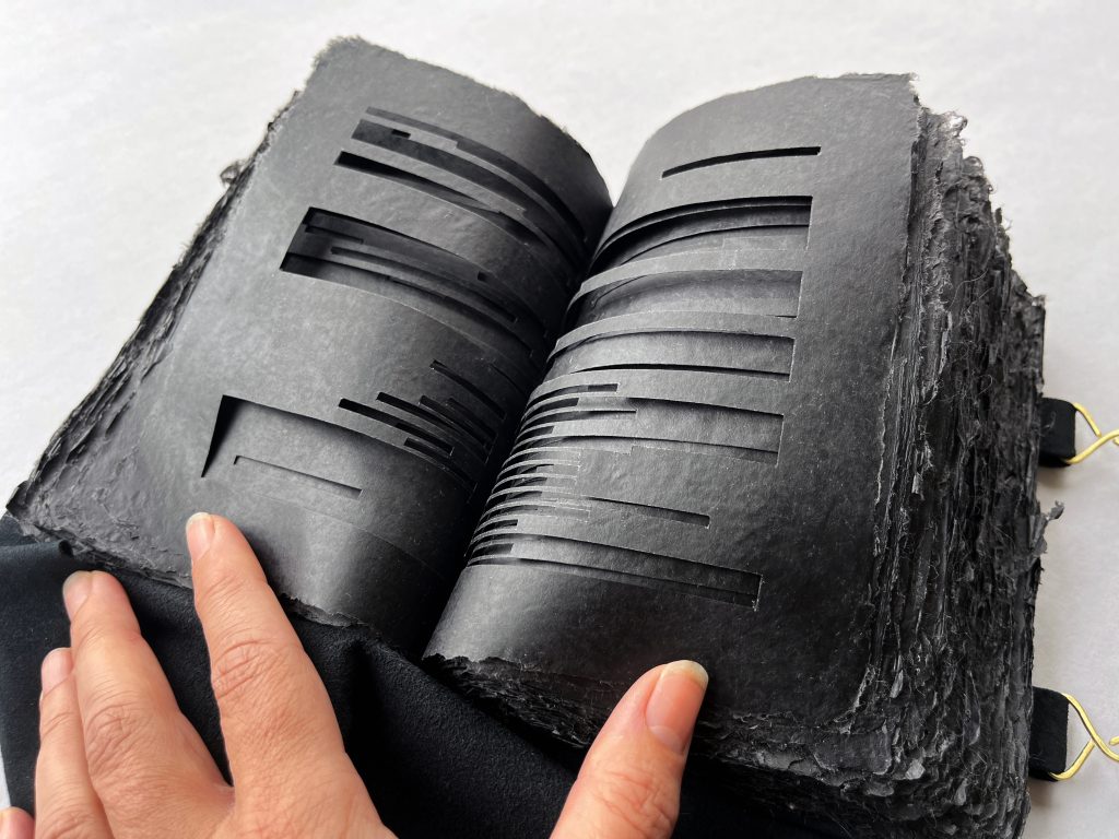 More than 1/3 of the 448 page Mueller Report includes redactions. “In the Dark” contains each of these pages hand cut in documented order with nearly 1,000 redactions in total. The text pages are waxed black pigmented overbeaten abaca handmade by the artist. The book is bound over double raised cords laced into quarter sawn white oak wooden boards with sewn endbands and is covered in black suede with brass embellishments. It is housed in an archival document box in the same manner as a Medieval manuscript might be stored in a library vault. This book is, by its own account, an artifact of modern American history.