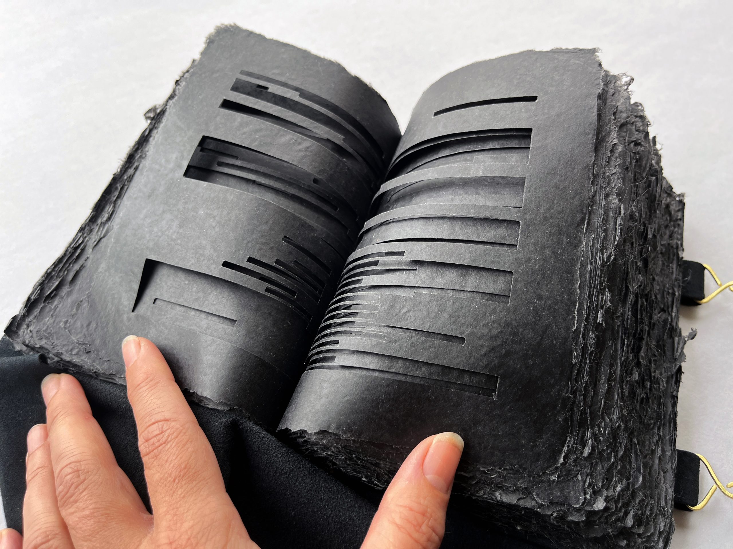 Waxed black pigmented overbeaten abaca handmade and hand-cut by the artist, quarter sawn oak boards, suede covering, and brass embellishments