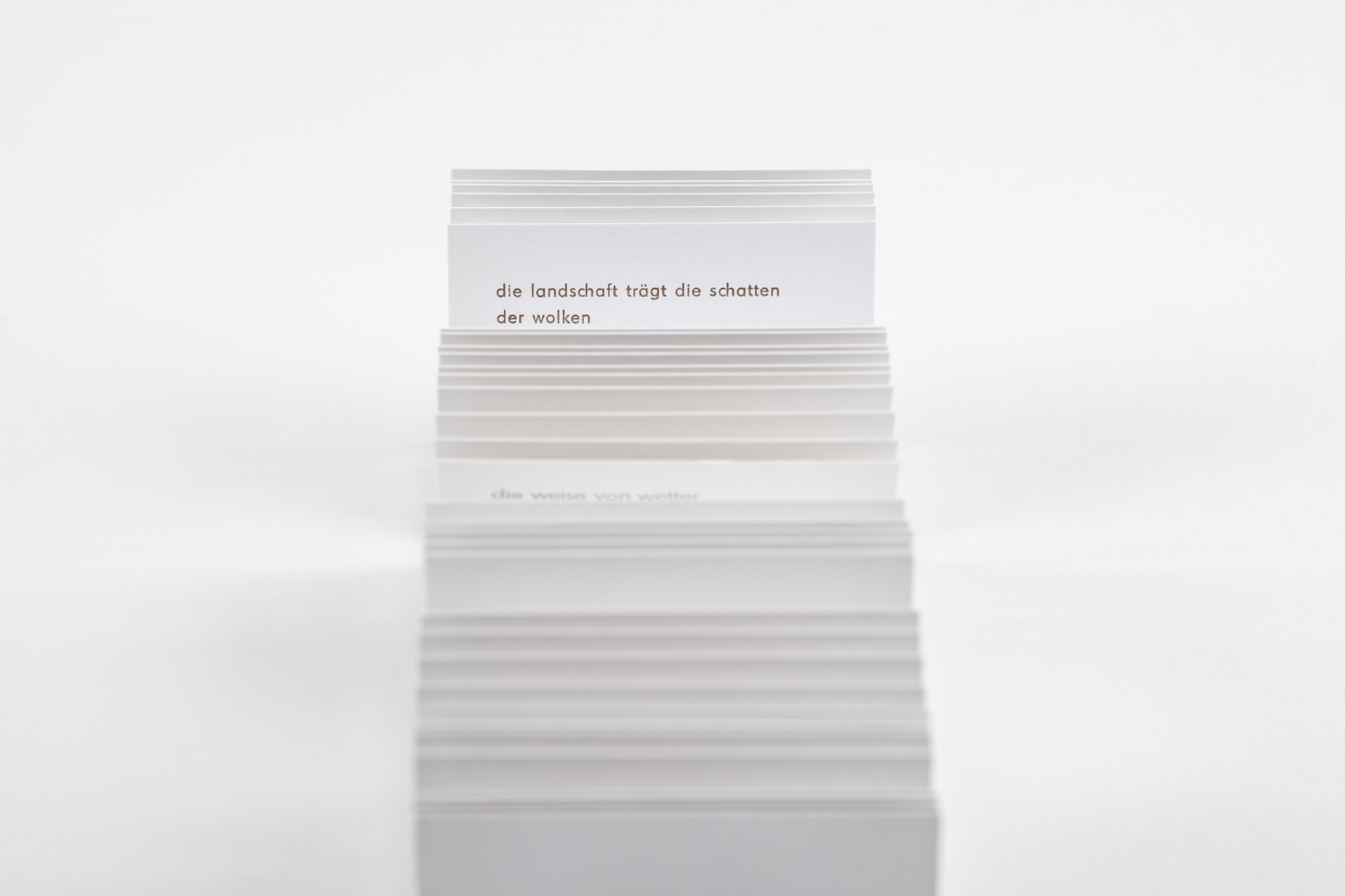 The weather books include a serial and ritual work. Since 2014 I have been translating observa- tions and thoughts on the daily weather into another book space during the period of a month.
