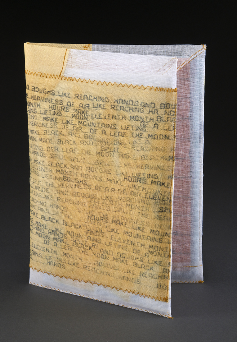 The special edition portfolio is made of crinoline, machine sewn and hand-dyed in fustic with the pressure printed, machine-stitched text from a cut-up poem written by Anne Greenwood. 8”x12”x1” closed, 8”x16.5”x.5 open, edition: 12