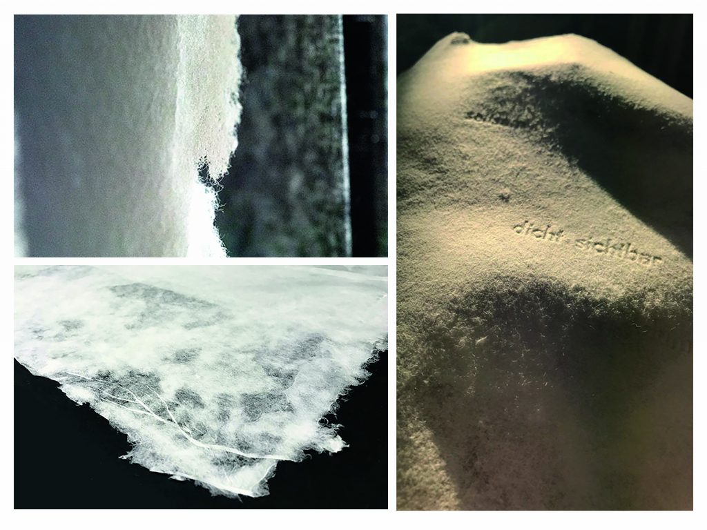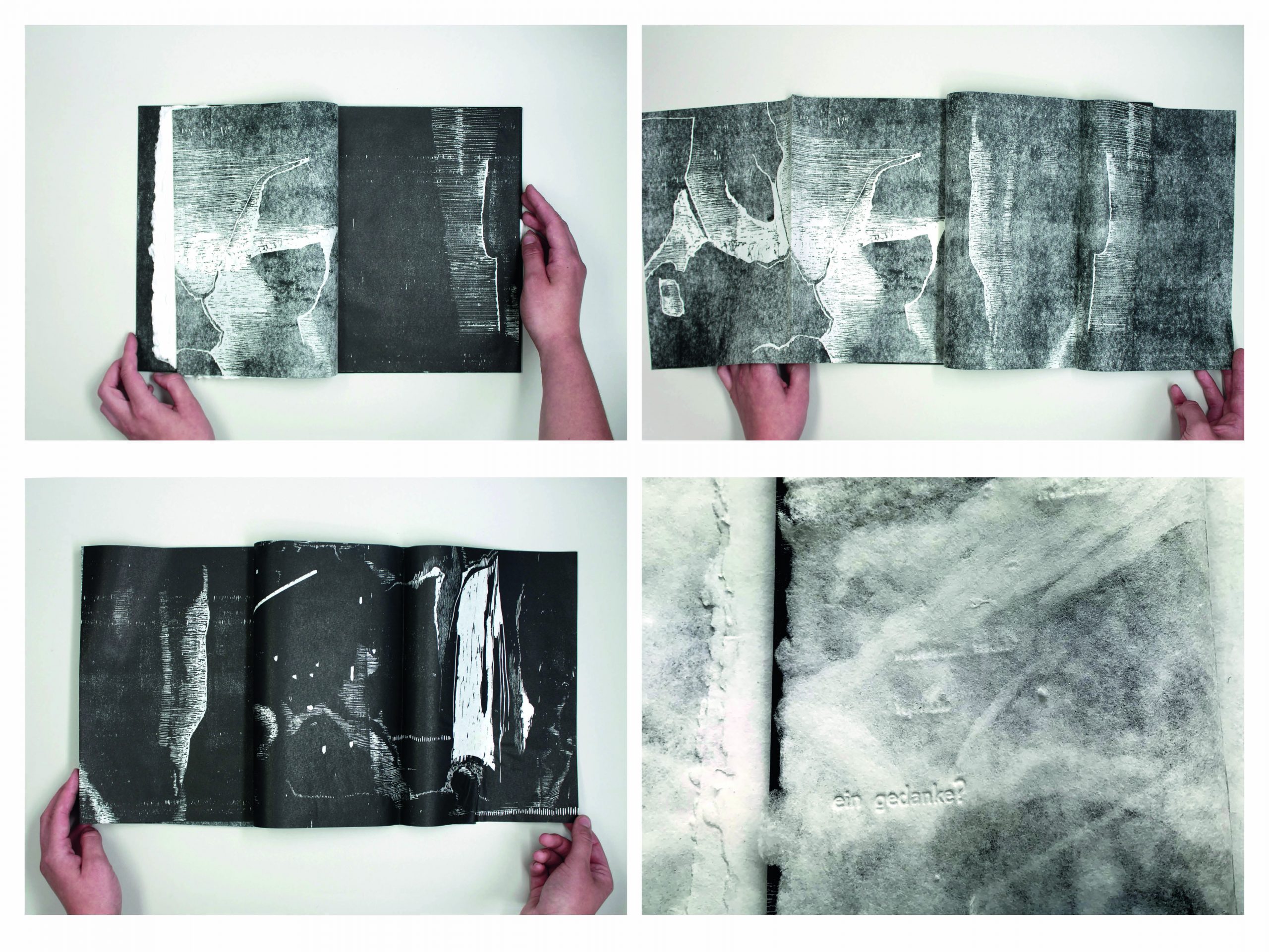 The original wood cut prints, as well as the blind embossed text fragments on very sensible handmade paper, translate the feeling of searching and insecurity. The choice of paper provokes the reader to slow down and to accept the risk of damaging the book by loosing the composure. The visual and haptic use of the material, the extremely soft paper and the fragile text fragments are a reference to the feeling of moving carefully in the fog, finding ones way.