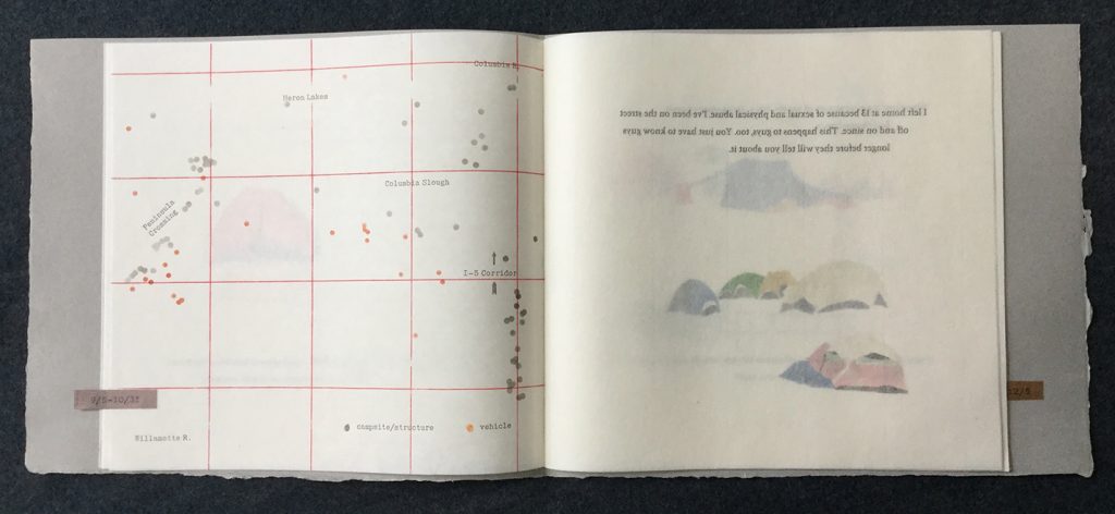 Images of homeless encampments taken from my daily commute in Portland, Oregon, translated onto thin Kozo paper with pochoir technique. Quotes from members of homeless population collected by Jill Severn. A project to illuminate a difficult and sad situation in our contemporary American life, produced to bring beauty to an otherwise anti-aesthetic reality, in order to facilitate conversation and meditation.
