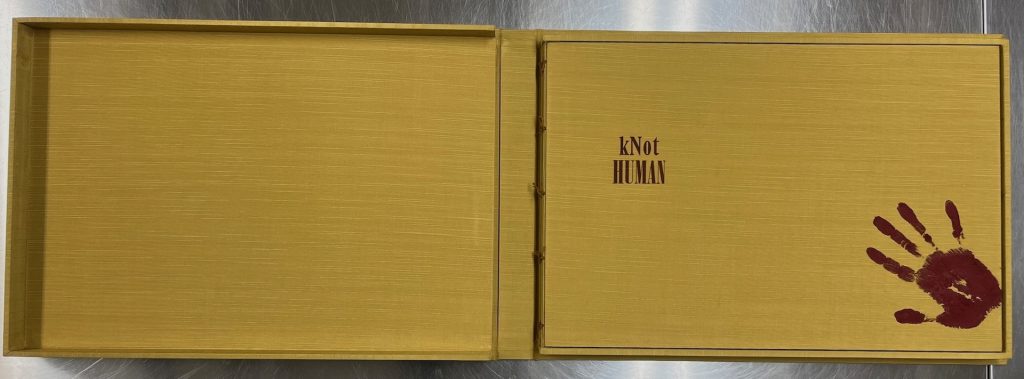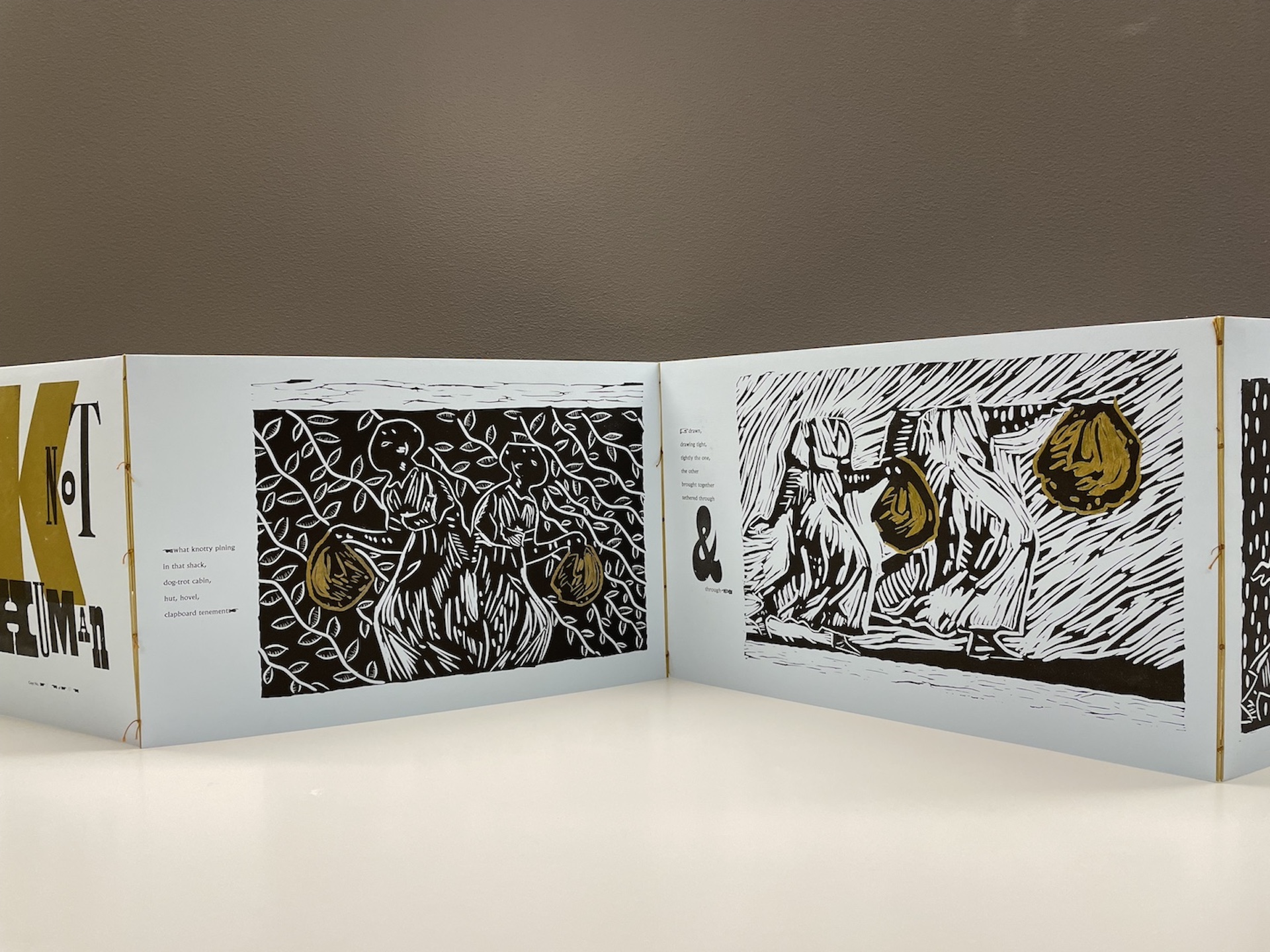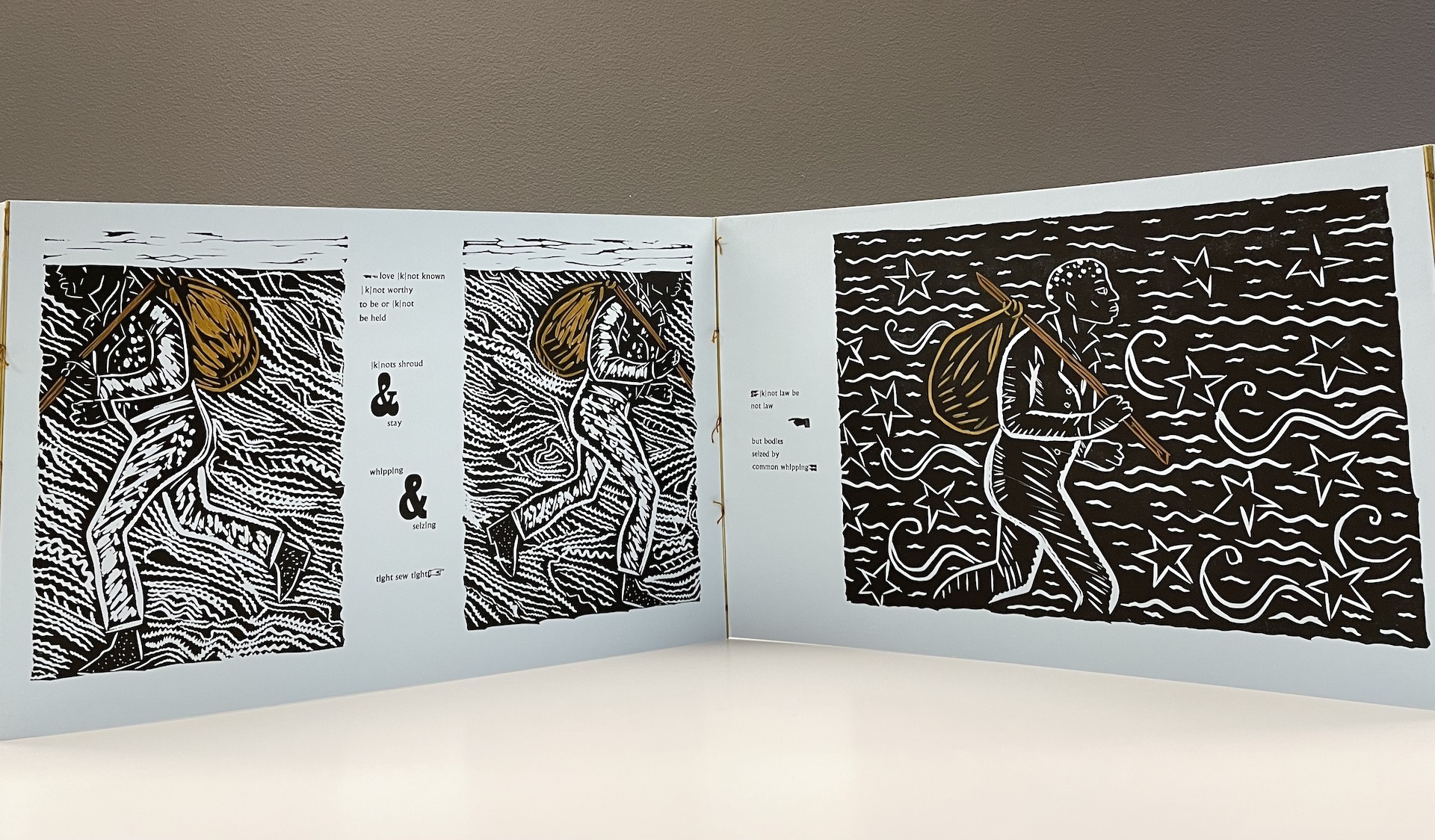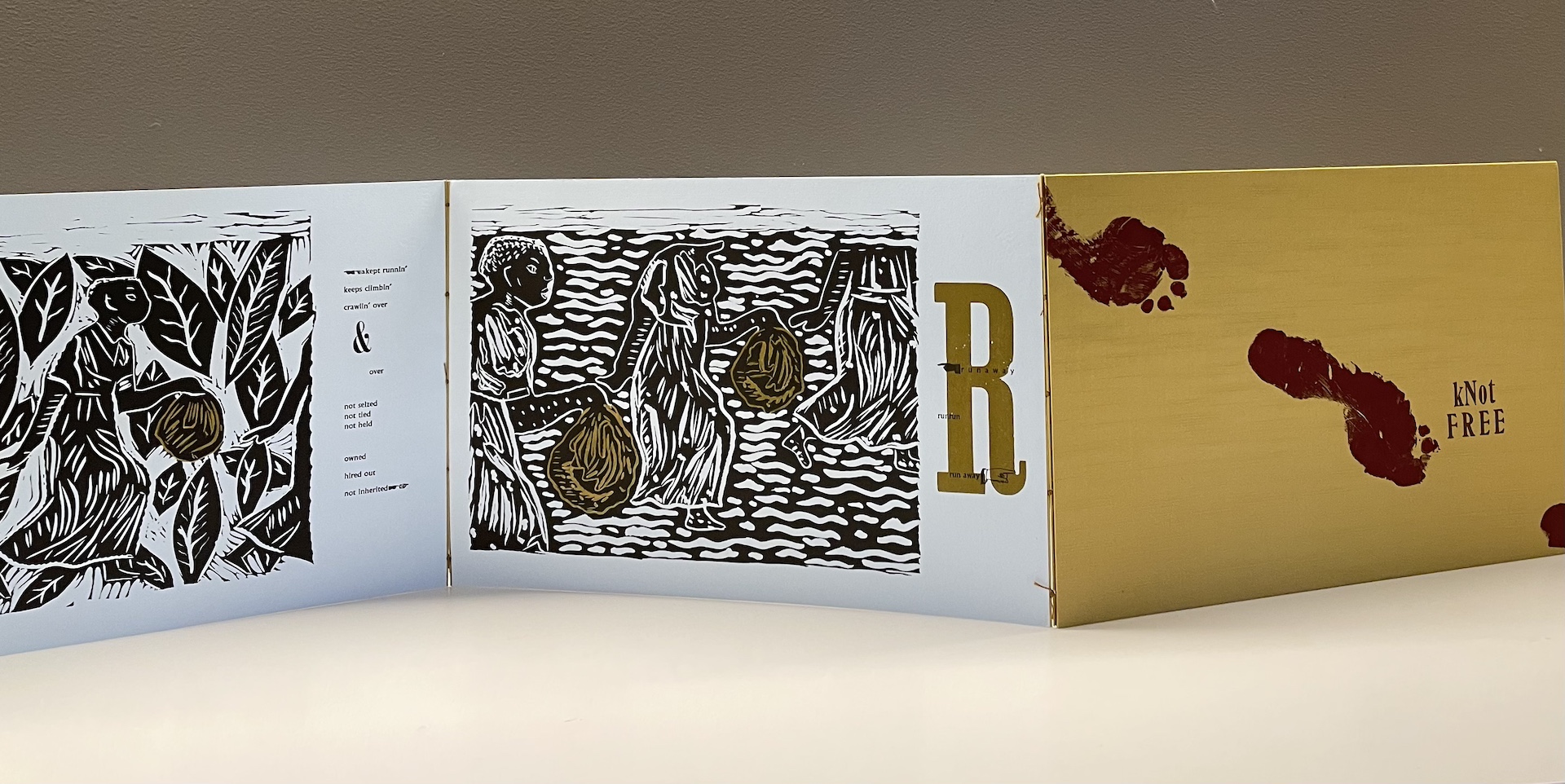 The iconic figures of a man and woman form the foundation of the series: “kNot free kNot human.” Each escaping figure toting a bundle or sack, containing the scant possessions of the possessed appeared, in flight, for centuries. While they were running towards an uncertain future, they were, also, symbols of and testament to the unceasing resistance perpetuated on all sides of the Atlantic by the captives. Wilson re-imagines the iconic runaway slave advertisement. Text and image evoke the complexity of the predicament that binds individuals to a body that they cannot claim as their own.