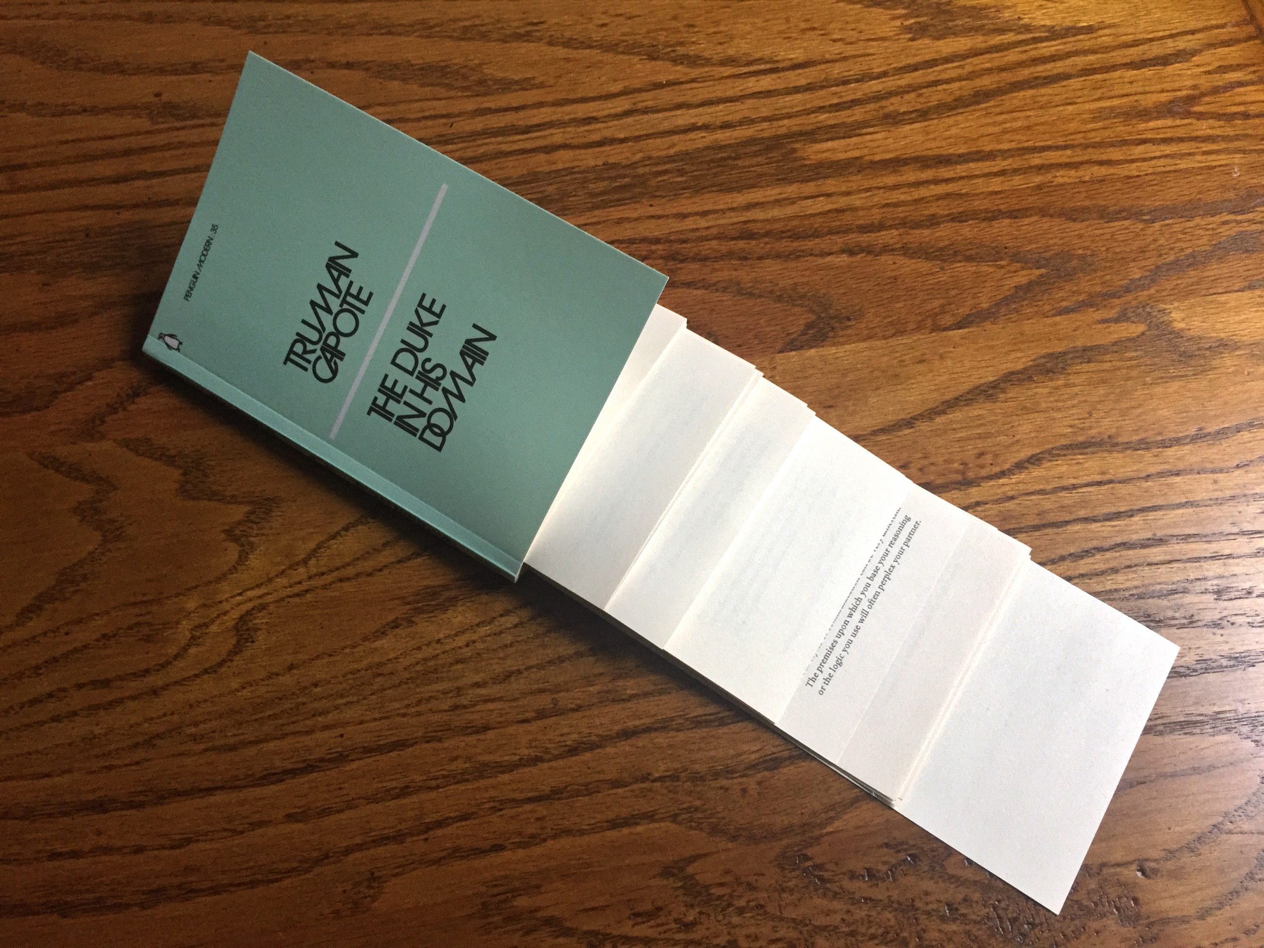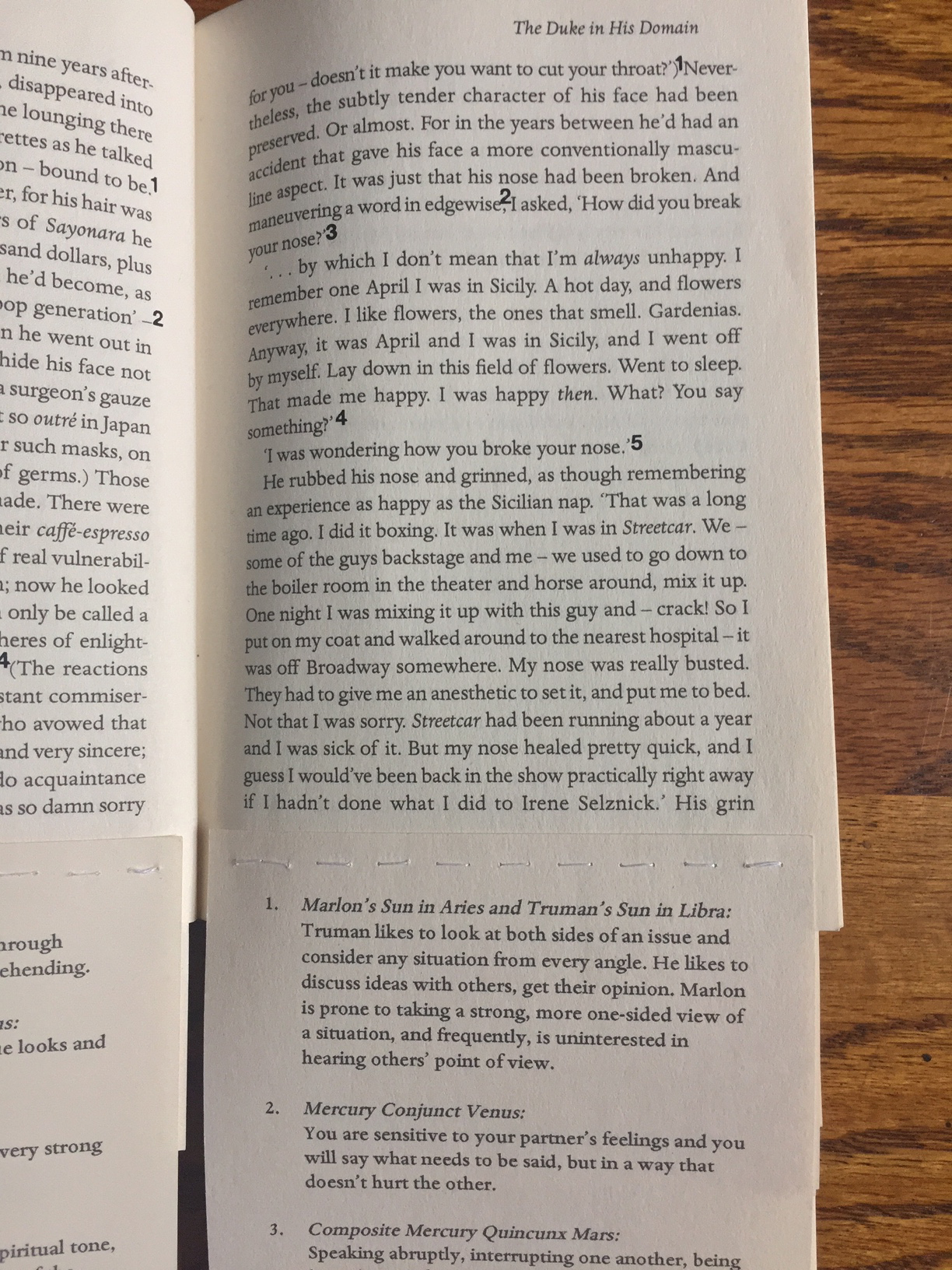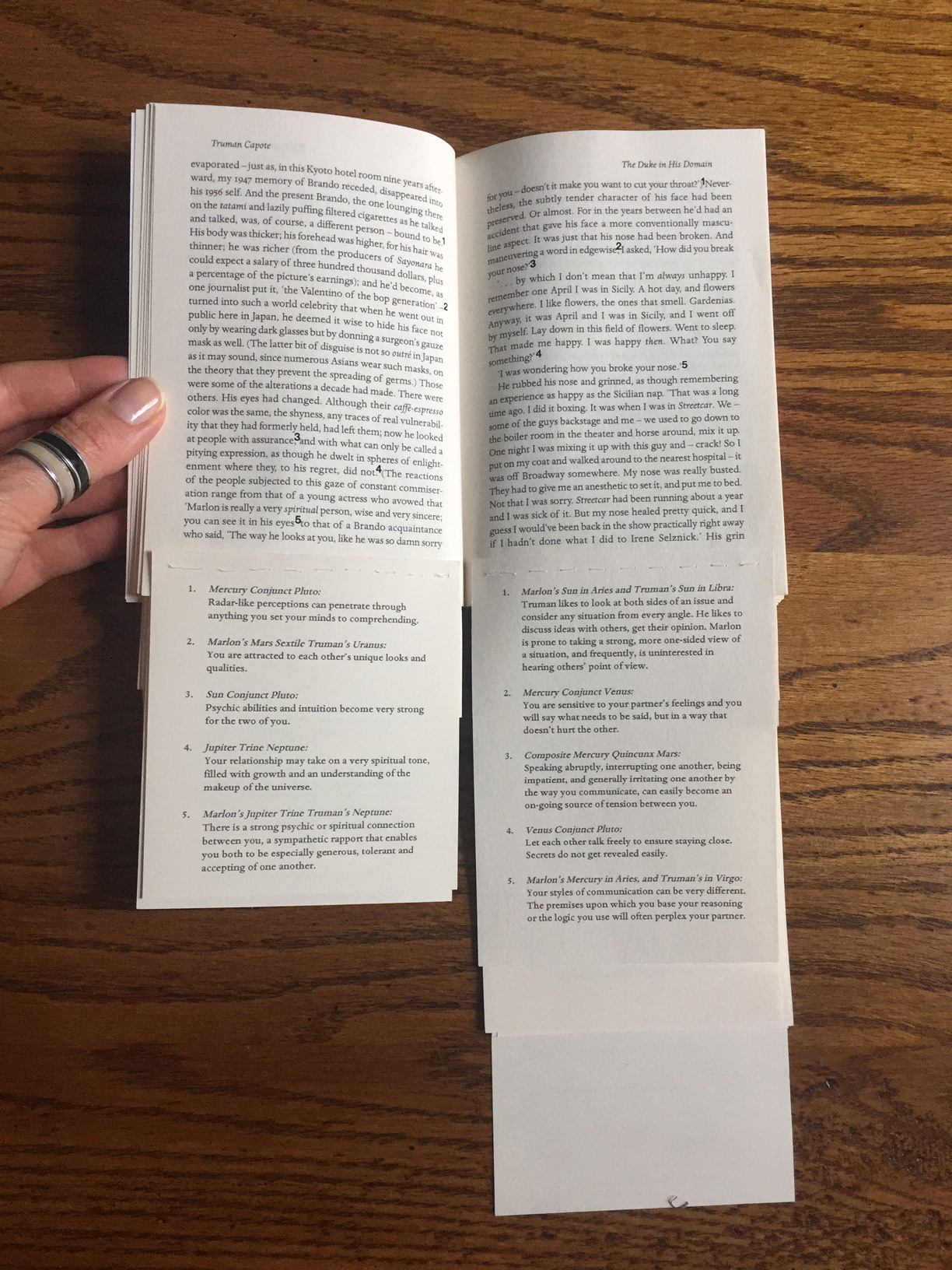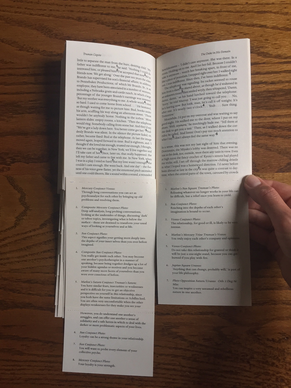 In 2018 Penguin republished the interview in their Penguin Modern box set. Given the intriguing relationship between the writer and the actor and how Capote managed to persuade Brando to be so open with his personal life, I initiated an astrological relationship compatibility report, which compares and contrasts aspects of a couples characteristics based on their birthdates, to see how they would fair as both friends and lovers. Extracts from this report have been typed and sewn as footnotes into the original text where pertinent. These new texts highlight or examine either the characteristics of one of the two men, or their reaction to the other, with often-humorous results.