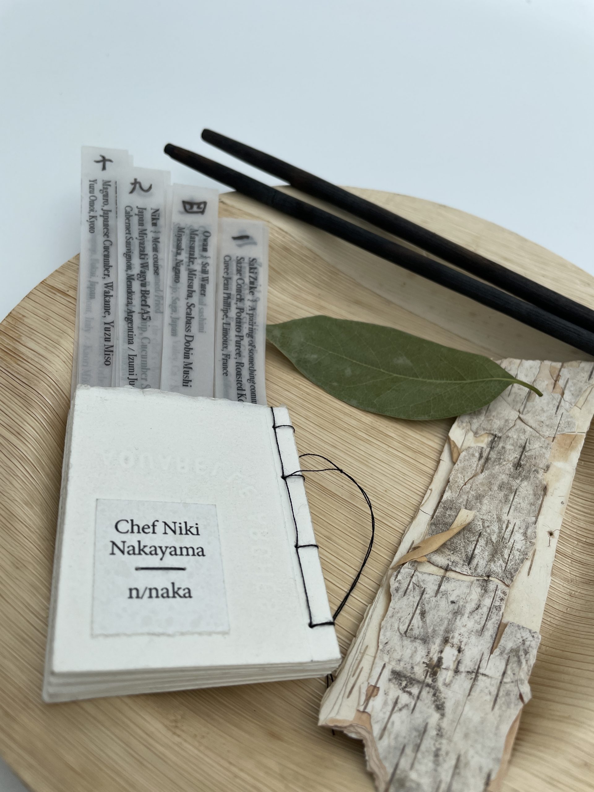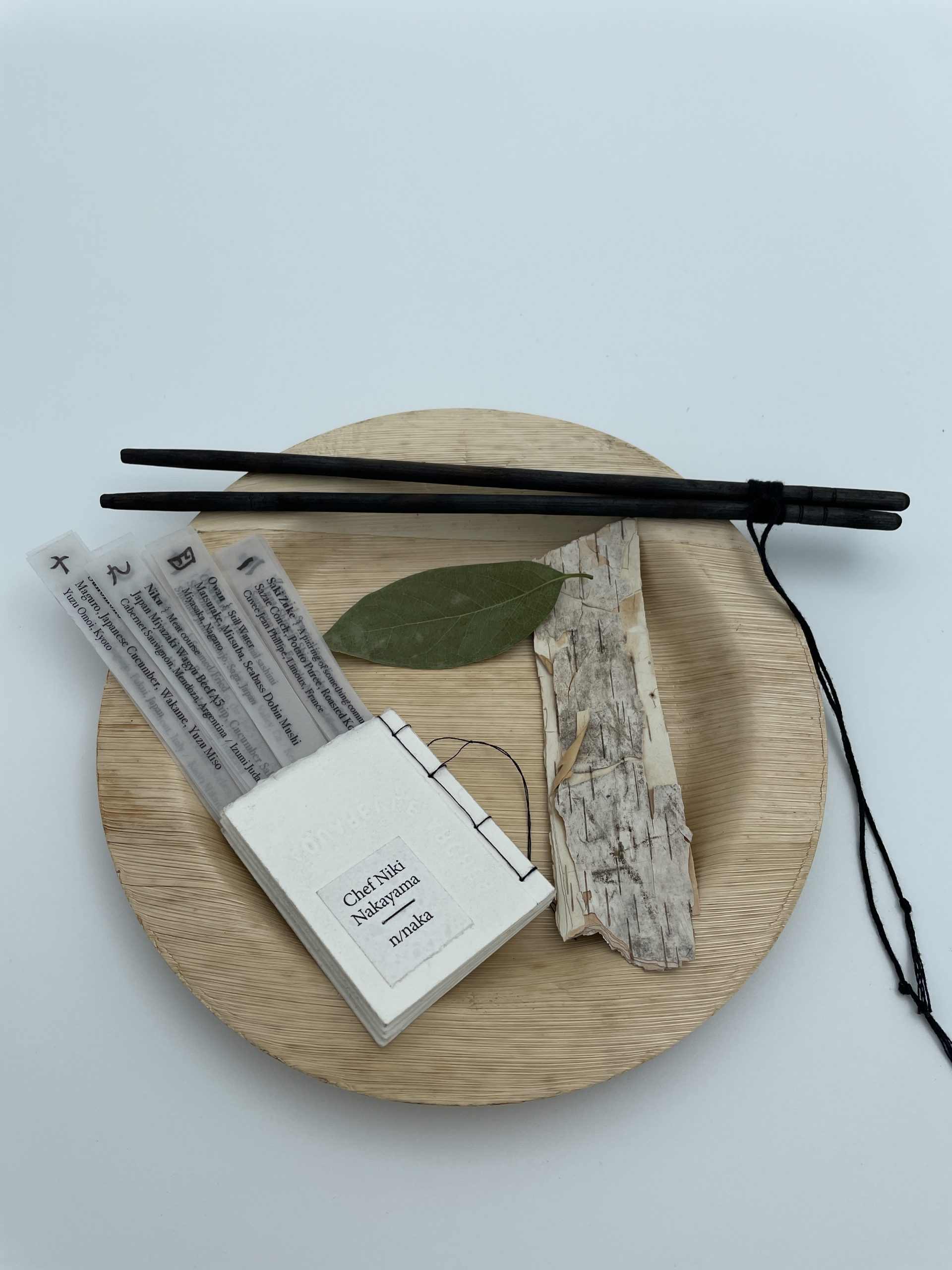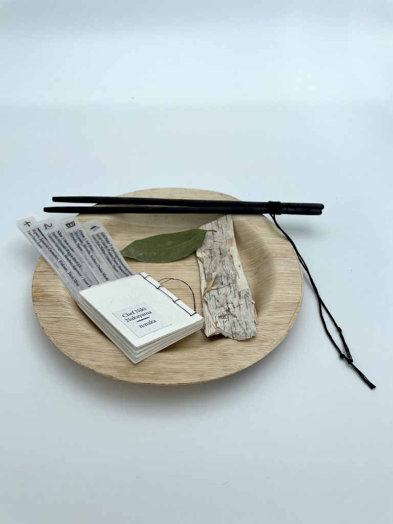 Unique book: sushi plate containing artist book, chopsticks, bay leaf and Minnesota birchbark