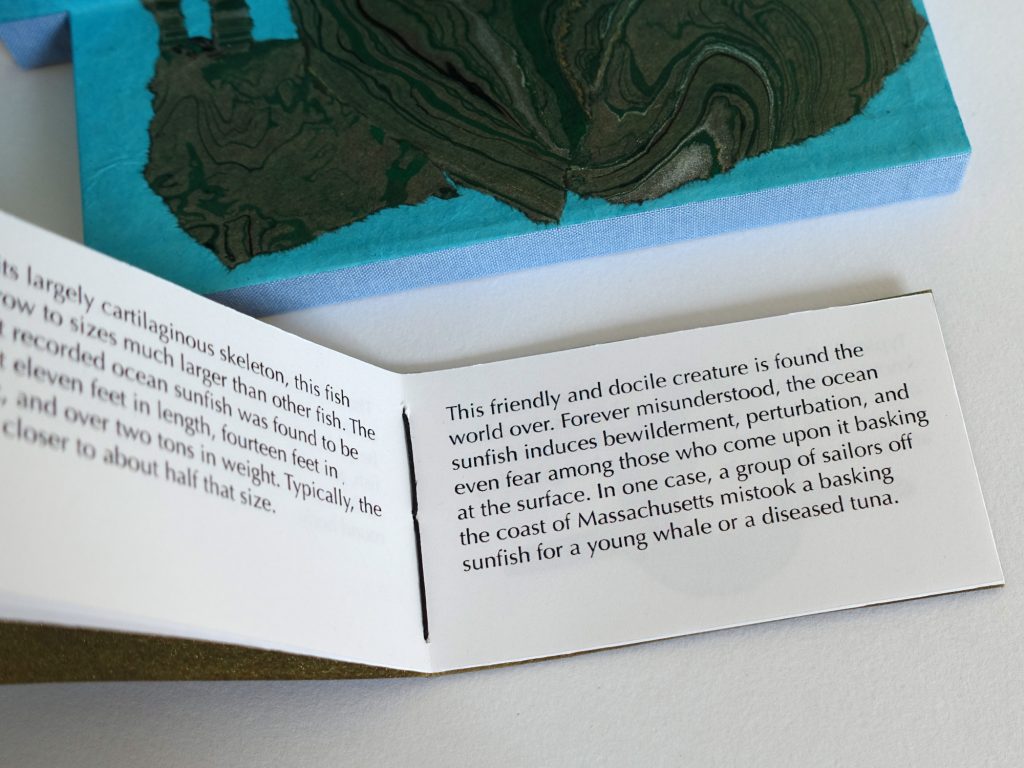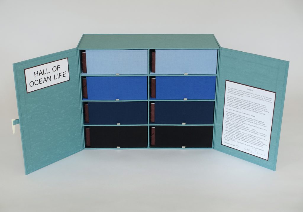 With The Natural History Museum #2, I continue my series of artist’s books inspired by natural history museums, a source of fascination for me. A miniature Hall of Ocean Life, this artist’s book contains eight drawers, which, when pulled out of the box that houses them, reveal dioramas of eight different ocean-faring animals, each with its own booklet describing the animal and its peculiar habits and history. The animals were constructed using book board, aluminum wire, lokta paper, rice paper, and cotton embroidery floss. Some have linocut- printed skins.