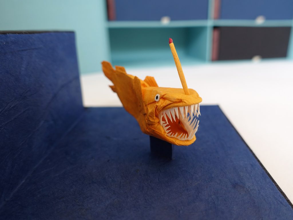 The book stays closed with a bone clasp. When opened, the drawers are revealed. The colors of the drawers correspond to the depths that the animals can be found (i.e. the animals in the lightest blue drawers are found in the shallowest water, and the animals in the black drawers at the bottom are found in the deepest darkest waters). Each animal’s diorama is revealed when the drawer is pulled out, and a little booklet describing the animal can be pulled out of the slipcase built into each drawer. The booklets contain elements of mystery, history, and humor, as well as early scientific illustrations of the animals.