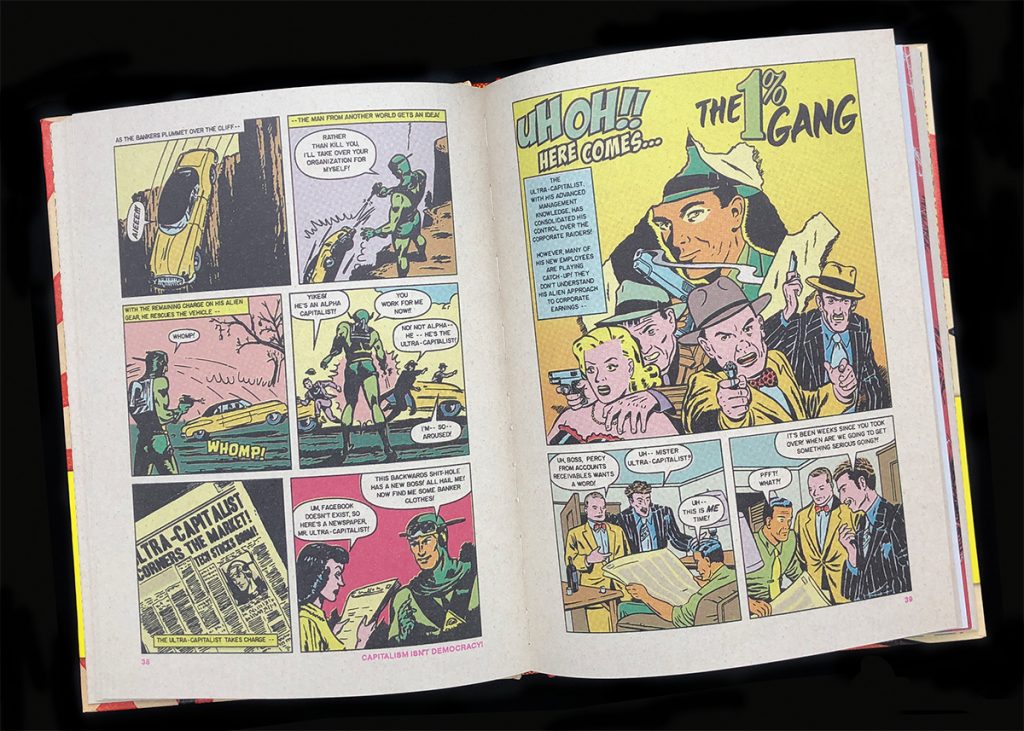 “It came to me that ‘50 comics were perfectly suited to the true crime story of today–the seemingly inexorable destruction of our democracy by vested corporate interests. So, once I had my subject, I combed through thousands and thousands of issues, selecting pages from disparate genres–crime, science fiction, horror and romance—and linked them together visually,” said Sperandio.