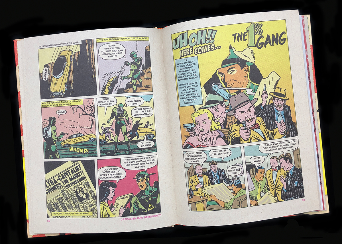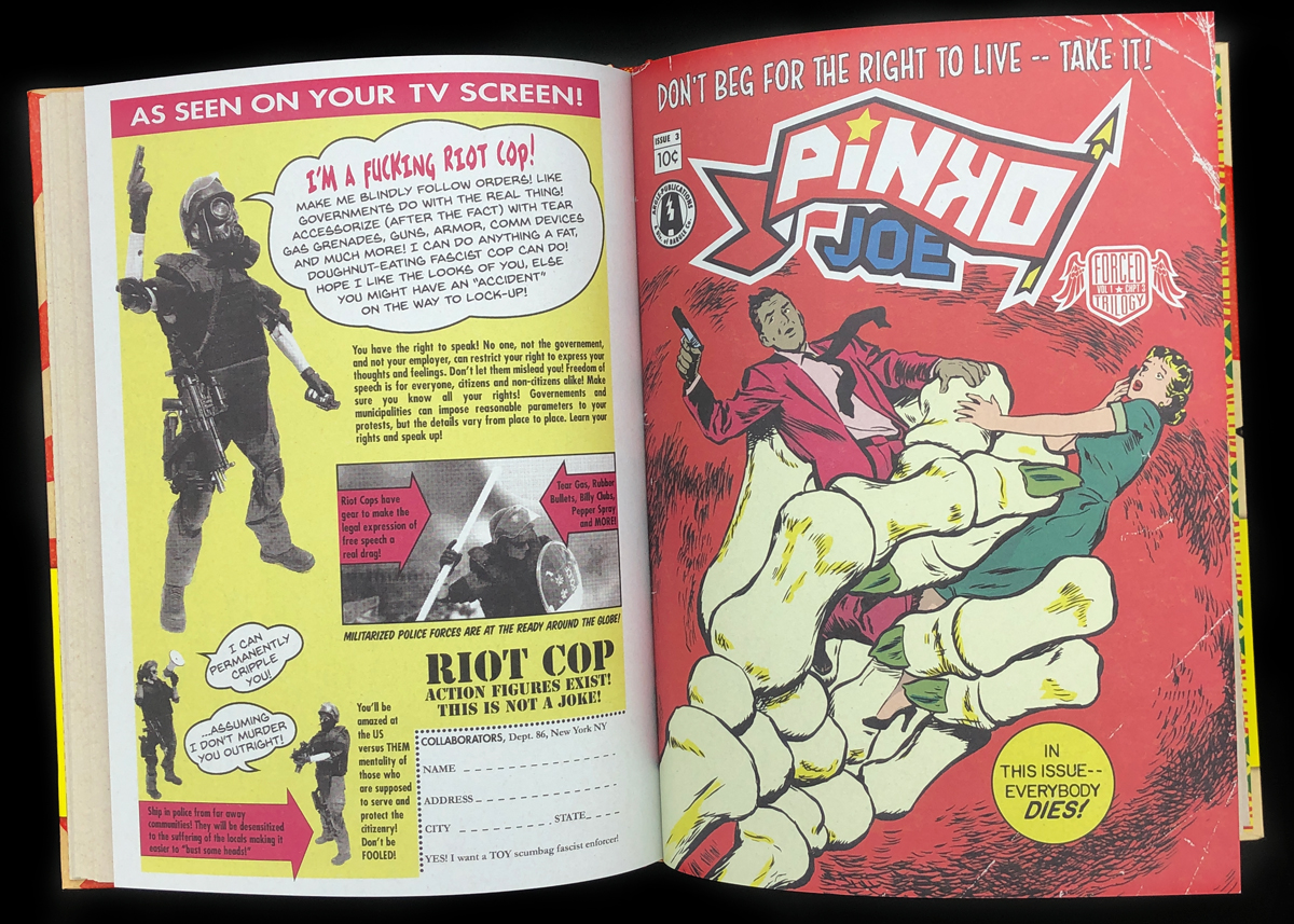 The casebound cover for PINKO JOE bundles floppy, news print-like pages into three 32-page chapters. And, what’s more, this comic for the 99% is only the first installment in a forthcoming trilogy: volume two is entitled GREENIE JOSEPHINIE and volume three, RED WHITE AND U BLEW IT ALL 2 HELL.