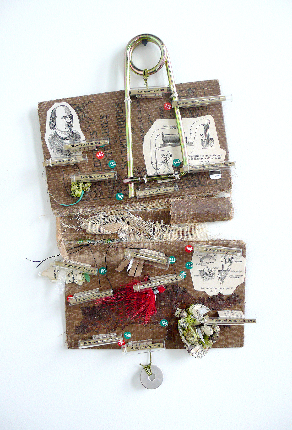 I use a 1921 scientific book for young public that serves as my soil.The book is damaged, such as the land, which has lost its balance. Concerning waste, the earth transforms well the fiber of the natural materials as paper. But the human has added many material called “inert” as plastic, metal, glass, etc.