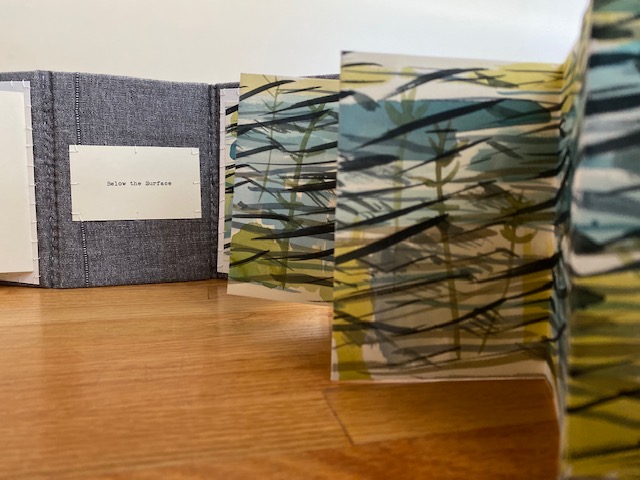 The pages for Summer Lake were discarded materials from a Minnesota Center for Book Arts artist. I spent one week on a Minnesota lake last summer and set out to paint one lake or lake edge impression a day. I had packed limited book board, thread, and discarded jeans and shirts from family members. The cover for this book is using a Boro Japanese technique of repairing cotton clothing. The structure for this book came from an idea of putting my watercolors in to a gallery/ book form and an accordion seemed the most natural support structure for the drawings. The words in the book are drawing titles and also a litany poem of the week on the lake last summer. I am working on some future ideas of lake impressions during fall, winter and spring.