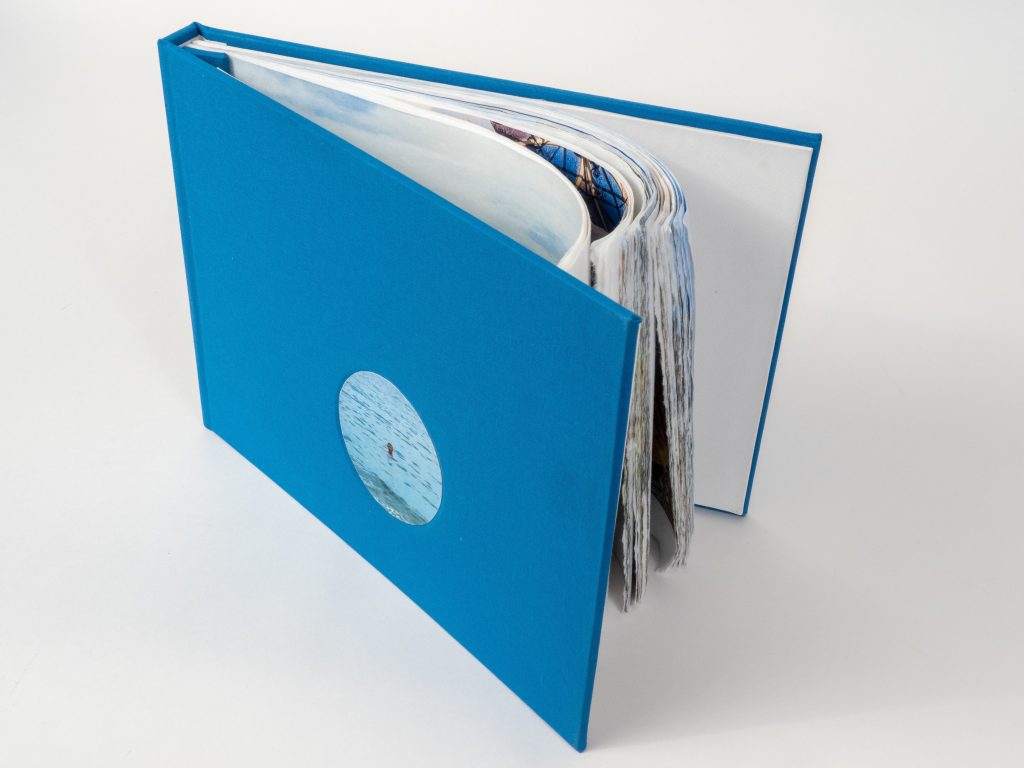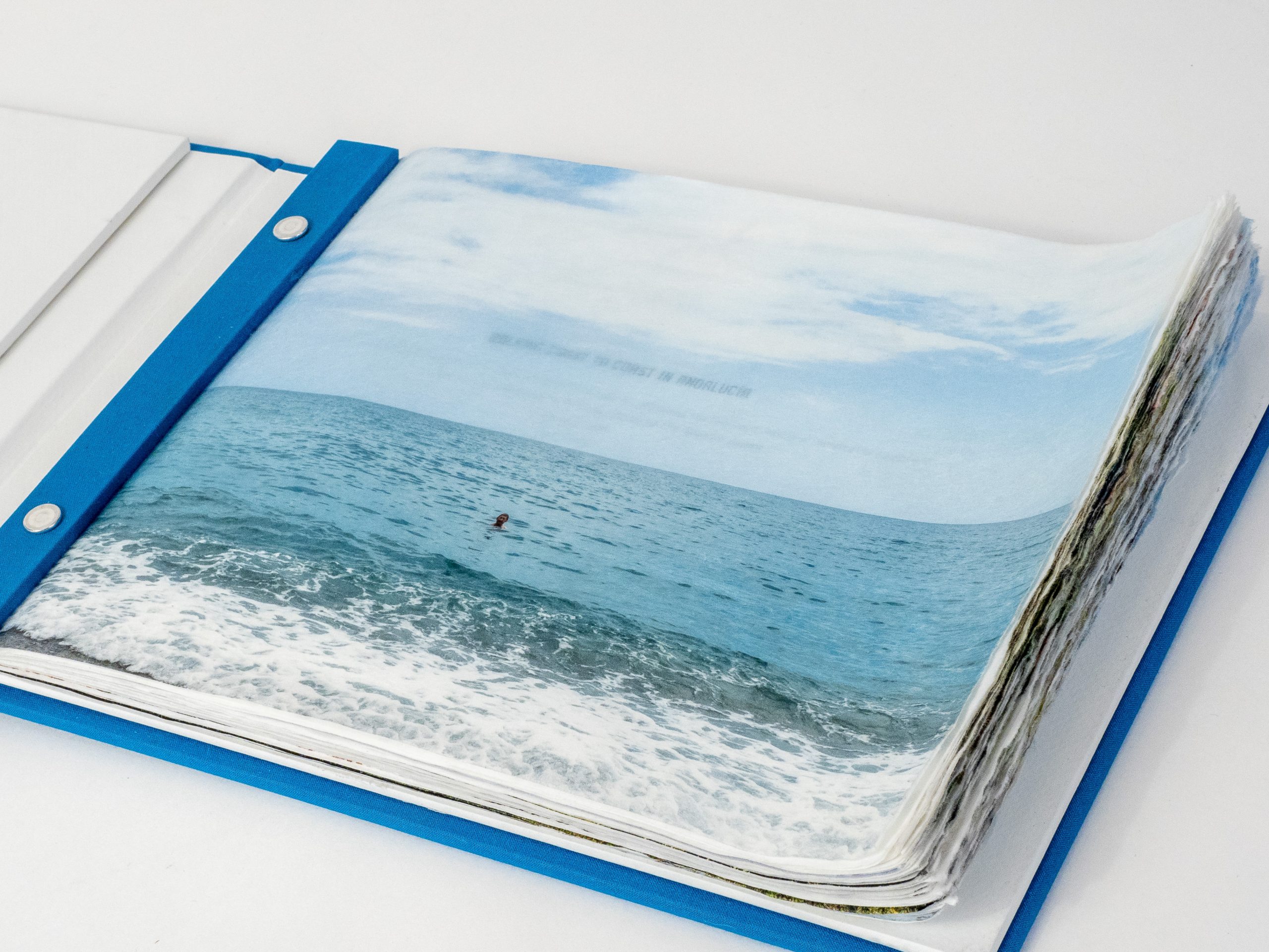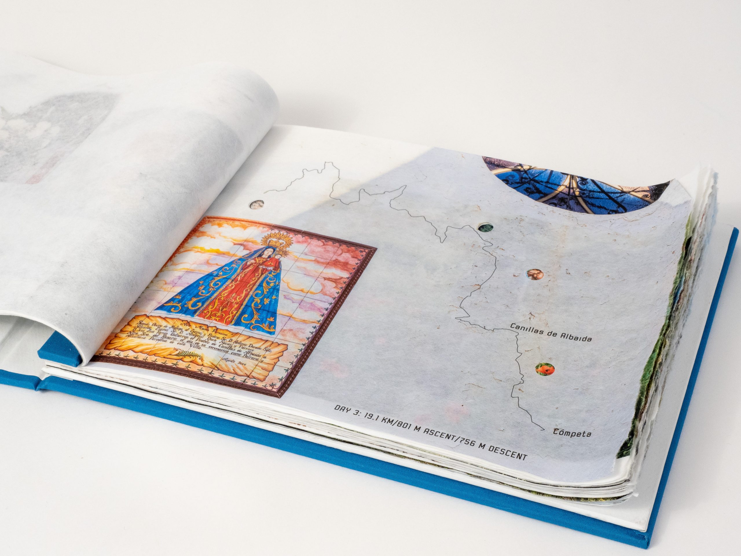 The pages are printed on a thin Awagami 30 gsm kozo inkjet paper, hand-altered with torn fore-edges and variously crumpled and punched in response to the day’s walk. In this sense, the paper itself becomes part of the narrative. Bound in a hard case with blue fabric bookcloth —the deep blue Andalucían sky—the front cover and spine open to lie flat, revealing the book pages, bound along the left edge with aluminum screw posts and a bookcloth-covered binding strip. The heaviness of the binding, similar to a ship’s logbook, contrasts with the lightness of the book’s pages. A feathery journey wrapped in a sturdy document.