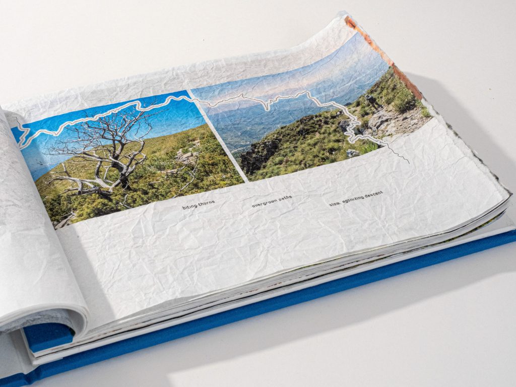 Walking Coast to Coast in Andalucía (2019) is a unique, handmade book using photos, prose and cartography—all printed on translucent pages—to tell a story of endless steps taken minute by minute, day after day on a 22-day walk across the Penibetic Mountain range in Southern Spain. It is the story of small things: of olive trees, rocky terrain, bathtub water troughs, good food, heat and blue sky; of ordinary moments converging into an extraordinary tale.