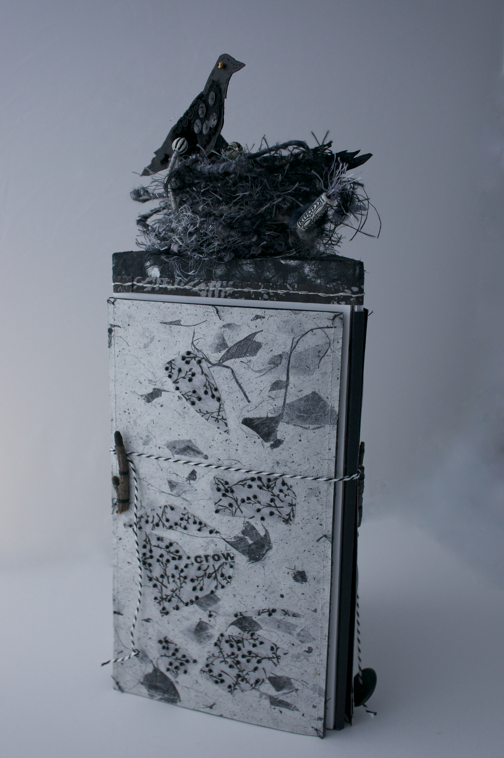 The closed book. Shown is one entry of the book which has three entries. This entry cover consists of two different papers beaded with black seed beads. The word crow, very small, is sewn on paper which contains threads and natural looking materials. This cover, as are the others, is held closed with a twig latch and black and white twine. On the top of the sculpture book is a nest of wire wrapped with various yarns containing two, beaded, paper crows.