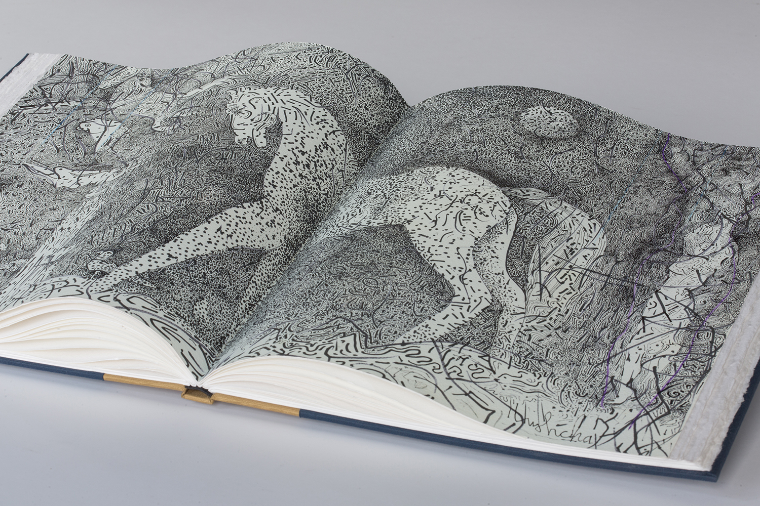 I began by selecting prints and drawings from the Hushcha archives, based on color, image, texture and shape, as well as how an image would respond to curves, and the confines of a “spread.” The books were bound as flat back case bindings. Most pieces included five sections of four folios each. Book board, book cloth, and 250Gg archival paper was used in the construction of each piece, Hushcha’s art work in the center spread. The book was then laid open, and I began forming the curves to each page, securing each with PVA, and/or a double-sided archival adhesive. Stretcher bars were attached to the back to provide stability and dimension.