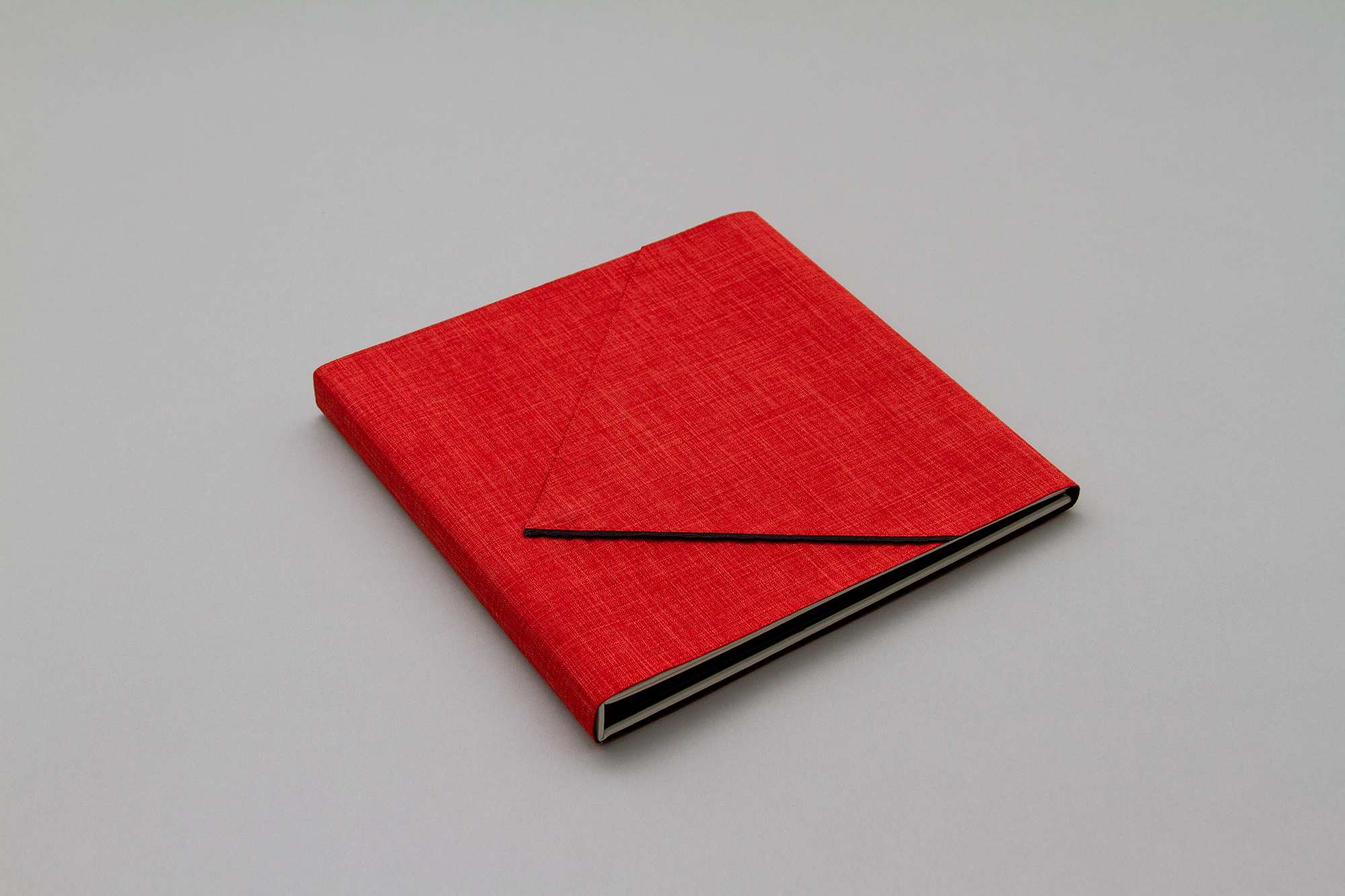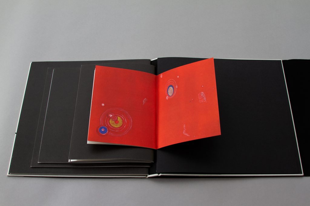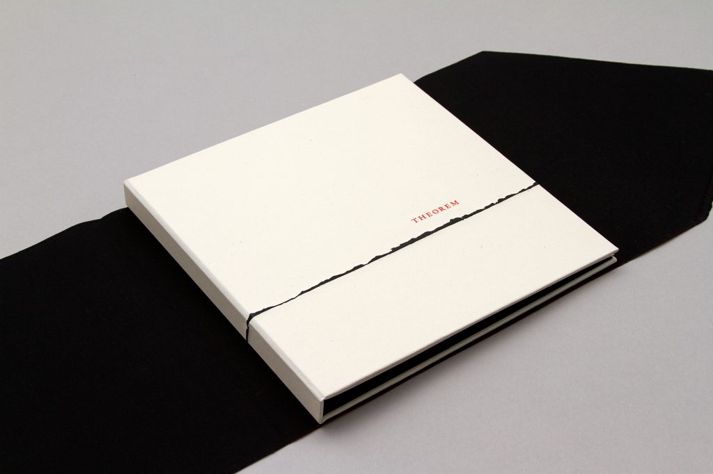 The unique aspects of Theorem’ s construction are integral to its emotional and aesthetic expression. The book is presented in a hand-stitched red fabric wrap, lightly attached to the cover by hidden magnets, with a hand-woven ribbon accenting its closure. Opening the wrap becomes a ritualized entry into the book’s private space. A spare cover with an embossed line (which runs across, around the spine, and to the back) foreshadows a pivotal moment in the book.