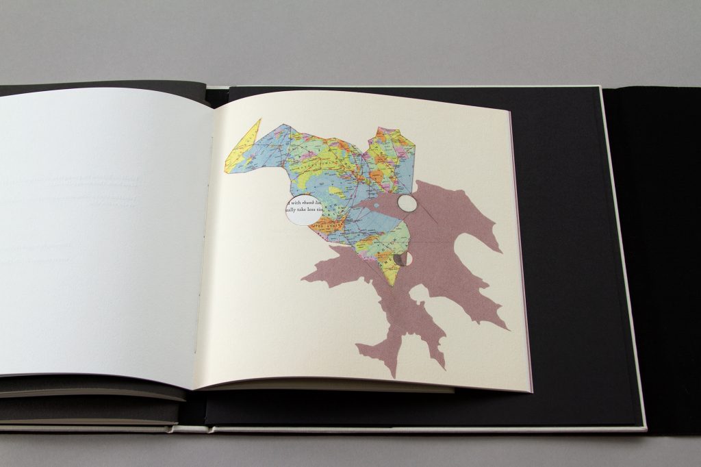 Letterpress printed on Canaletto Grana Grossa Bianco paper on an Indigo 12000HD and a Vandercook press. Embossed, silkscreened, and foil stamped cover with embedded magnets. Cloth cover wrap. Hand-treated and collaged pages by Antonia Contro; writing by Elizabeth Bradfield