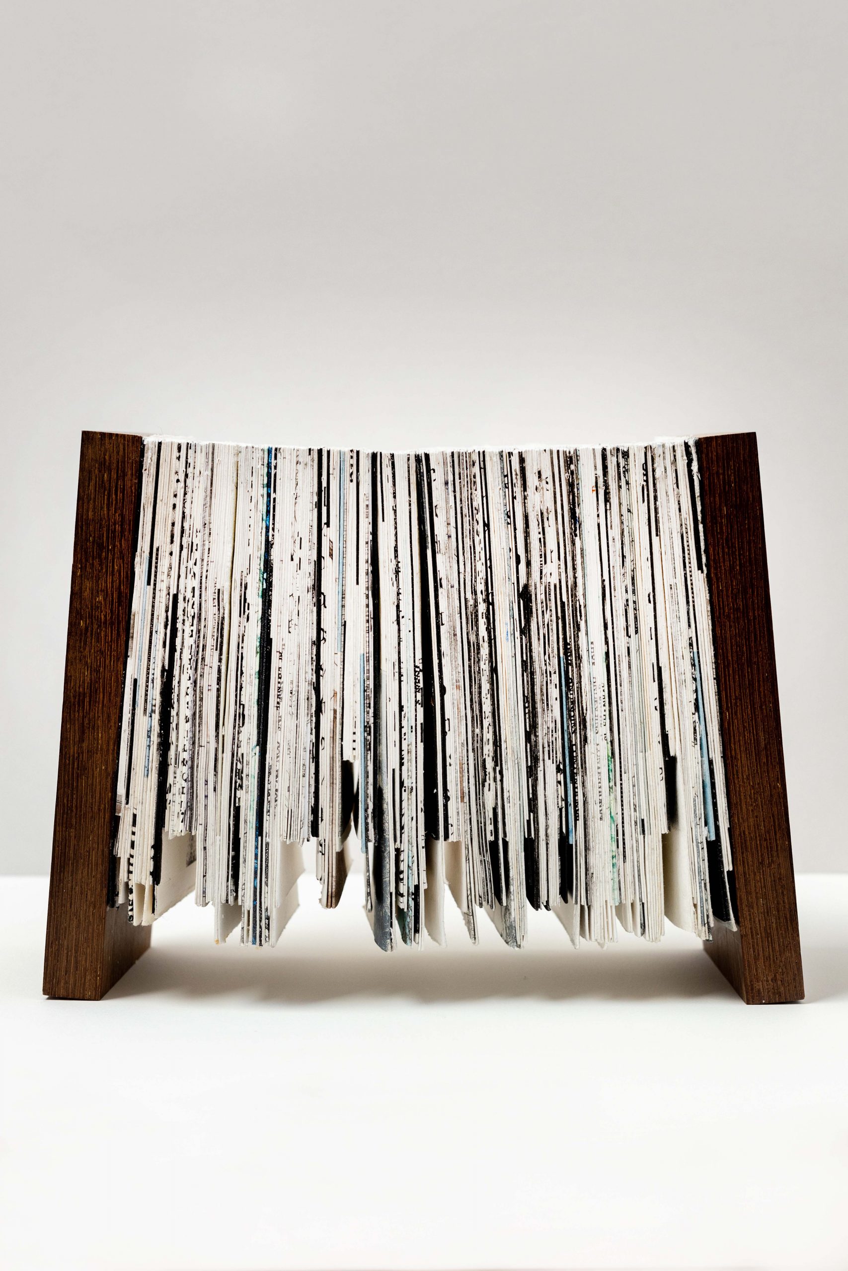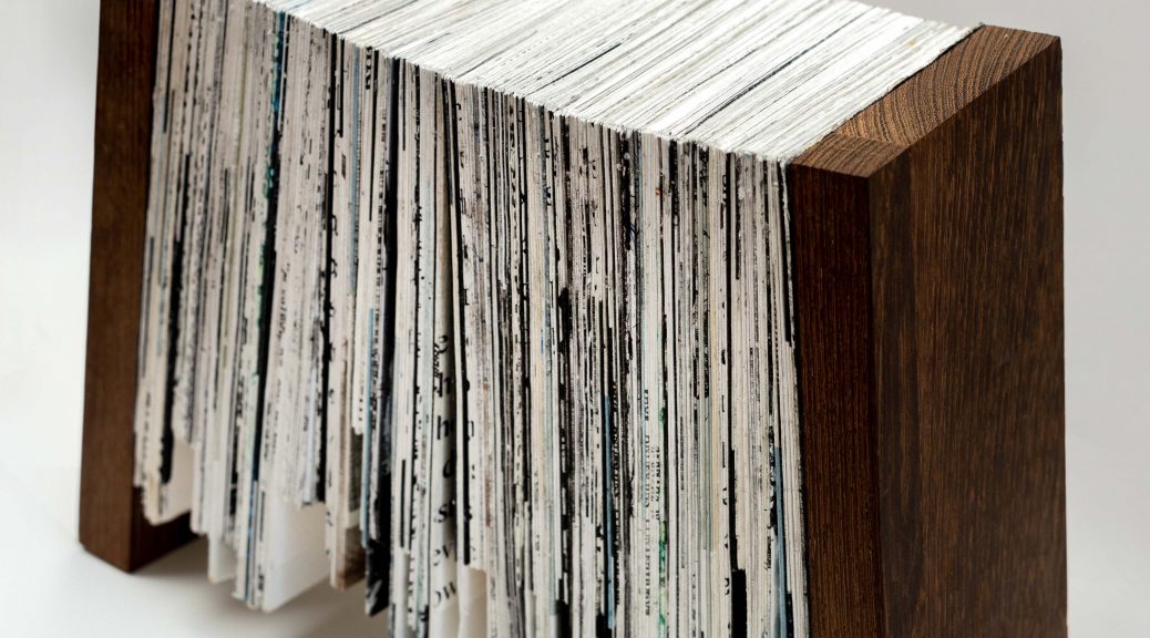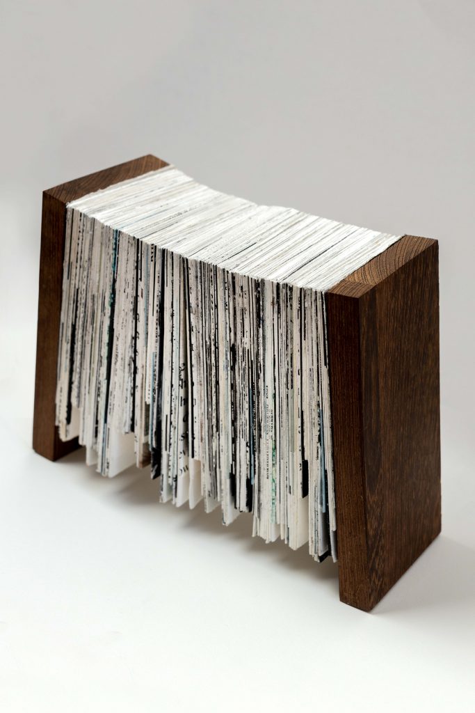 The test prints became a book sculpture. Each print was cut down and folded in the same way I would create a book’s signatures. Once folded the paper shows only 1mm of the imagery on the prints, in doing that one lands up with an abstracted glimpse into the print’s full image. Some of the spines are solid black or white, while others show hints of colours, lines and textures. When these signatures are stacked together they create an abstract linear “drawing”; a “timeline”.