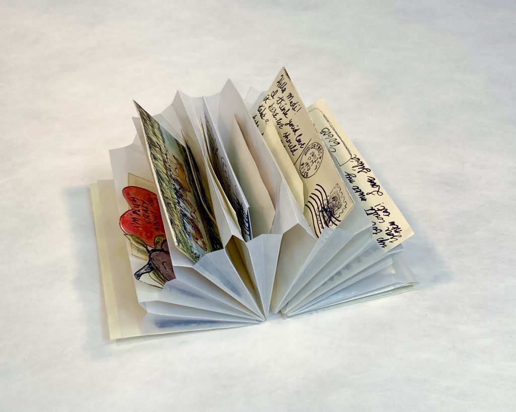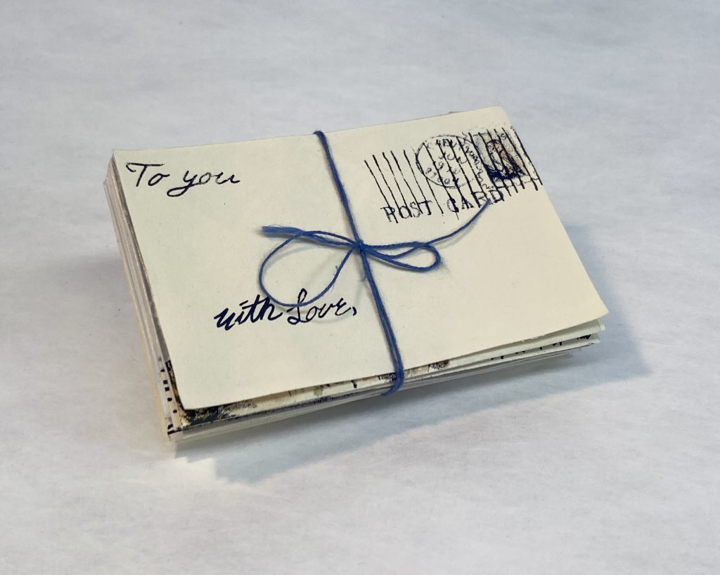 The book’s images are sourced from my own personal collection of objects. This included vintage postcards, stamps, photos, objects, and tickets that I bought in vintage stores, thrift shops, antique stores and estate sales. I also did additional material research on old letters, letter locking and stamps for additional content in the book. Following their collection, I redrew several of the objects and images and then exposed those images onto screens for printing. The prints were then hand colored with watercolor.