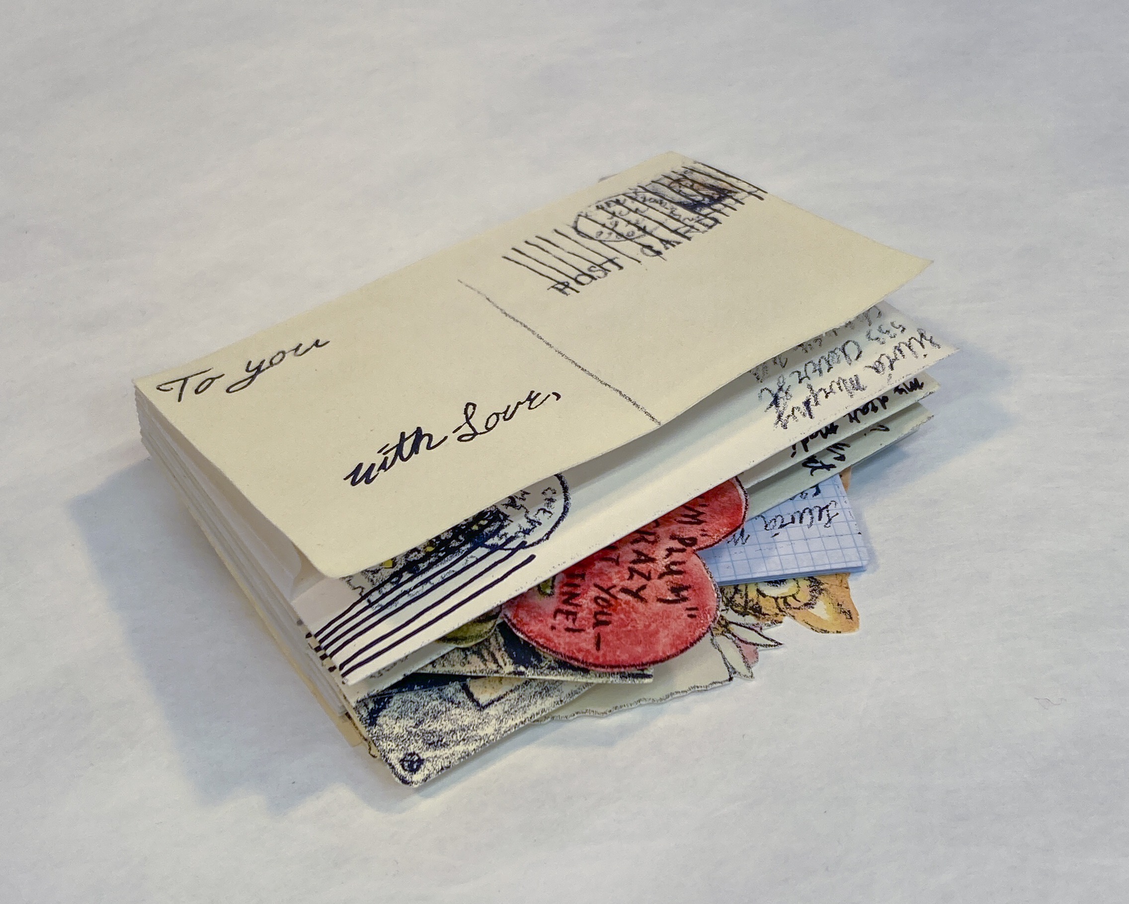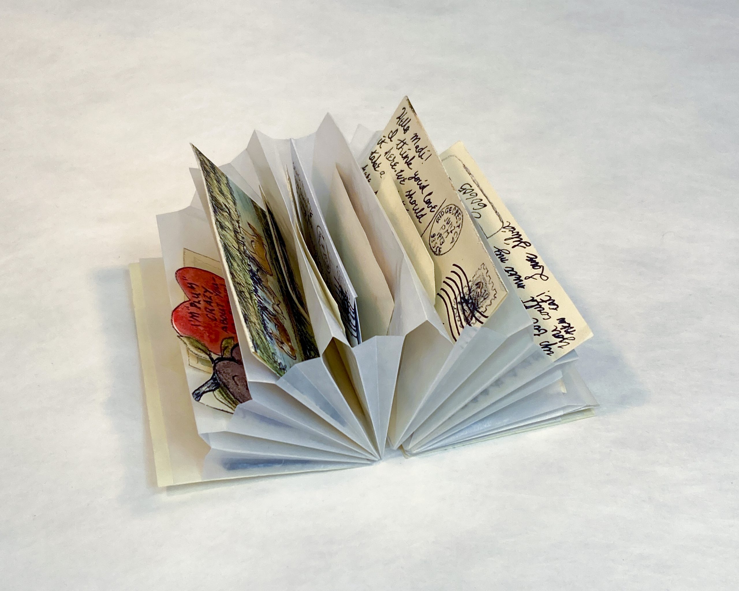 Inspired by my own habitual collection of ephemera and personification of objects, as well as a love for snail-mail, the book explores collections, sentimentality, ephemera and how narrative can be woven through those elements. In the glassine folded pockets are remnants of a relationship told only though items sent in the mail. The viewer acts as the collections keeper, the notes and photos