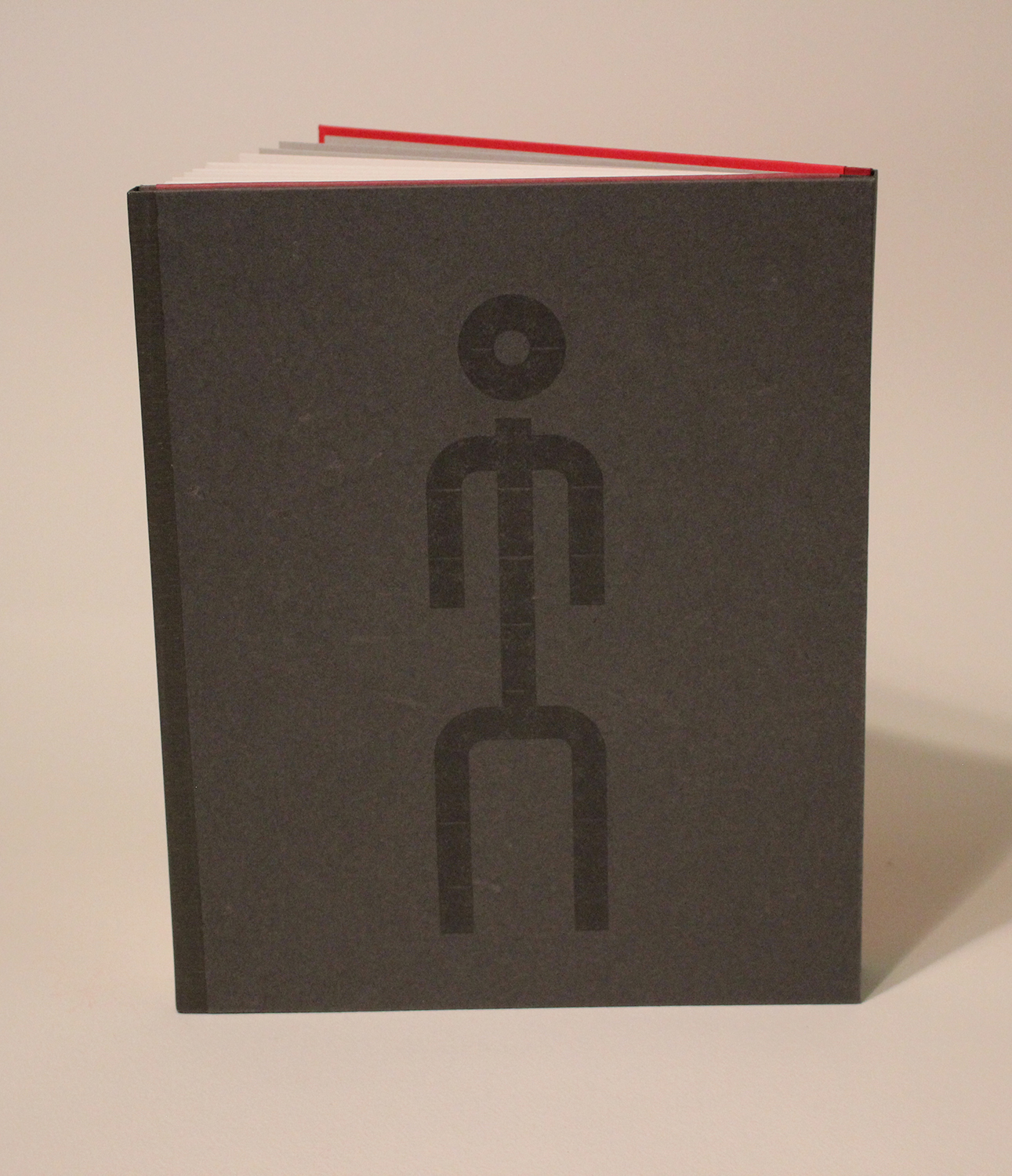 elevated view of the dos a do format, red front cover for Ha Ha side, sewn pages, gray front cover for Peculiar side, drum leaf binding.