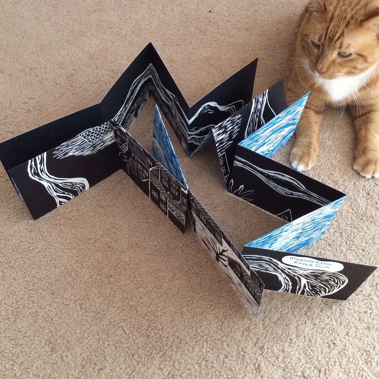 This book was an evolution of my interest in relief printing, diminishing wall space in my home and a wish to spend time with peaceful images. I also printed the River Water block on the back of the River Town print and cut it to make a meandering book. Emilie helped me to do the cuts. This was very successful.