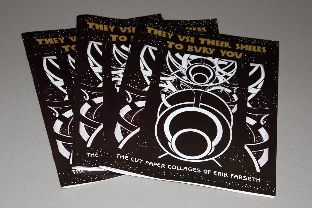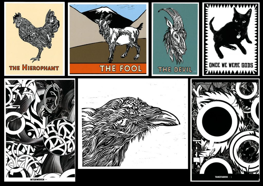This latest body of work is part of a larger project dedicated to the democratic production and distribution of art. Traditional gallery spaces become a jumping-off point for a variety of grassroots media shown and distributed in public spaces, designed to be participatory and accessible (storefront art, skateboards, etc.). As I repurpose and circulate images from my collages and woodcuts into screen-printed posters, wearable art, and zines, I’m less interested in the concept of “limited editions” than prints as affordable art.