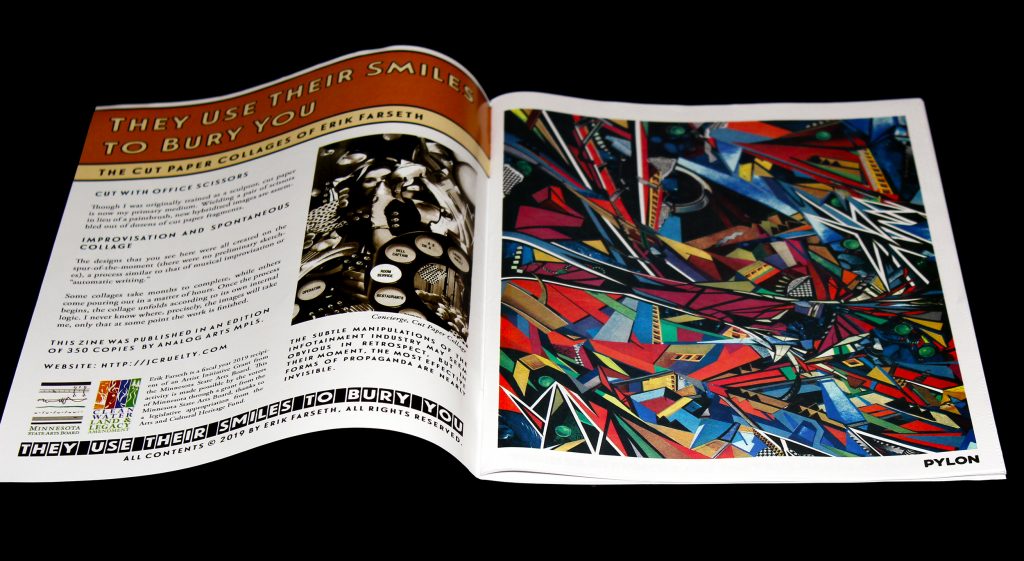 Zines are small, self-published magazines produced as a labor of love, with no regard for profit. The cut-and-paste aesthetic of zines was a direct result of artists laying out pages by hand, through a combination of line art, found art, and glue sticks — the same techniques I use to create my cut paper (“analog”) collages. Do-It-Yourself (DIY) publishing is a form of cultural output that seeks to break down the barriers between producers and consumers, blurring lines between artists and non- artists. Even when my artwork isn’t overtly political in its content, it is political in its process.