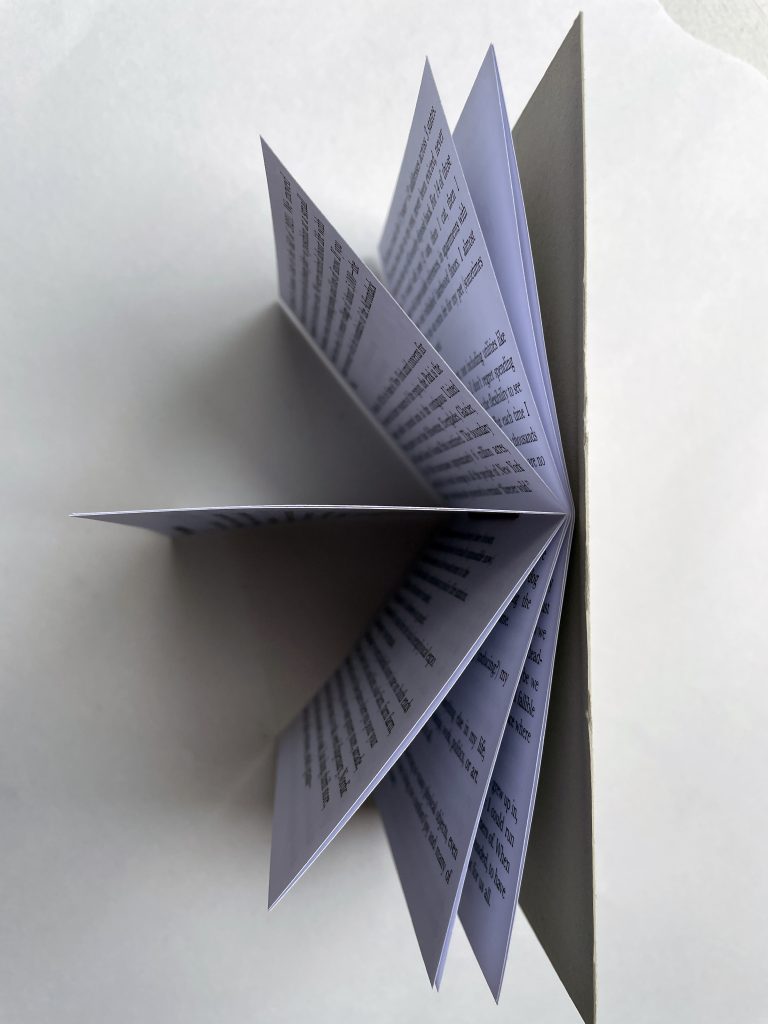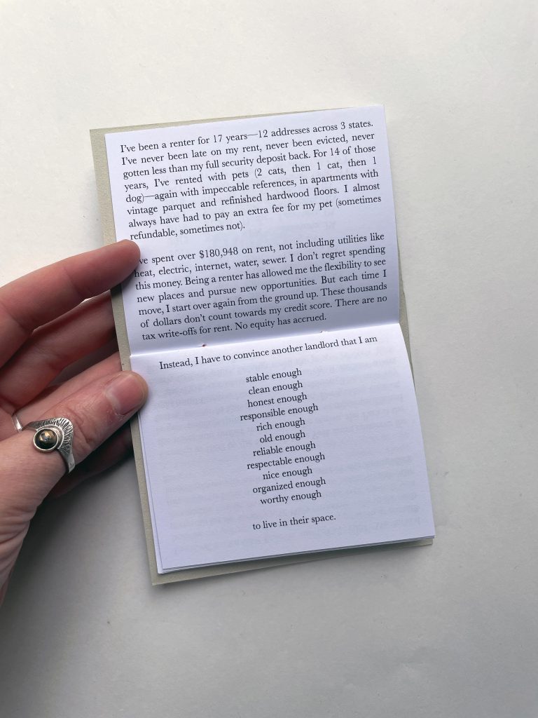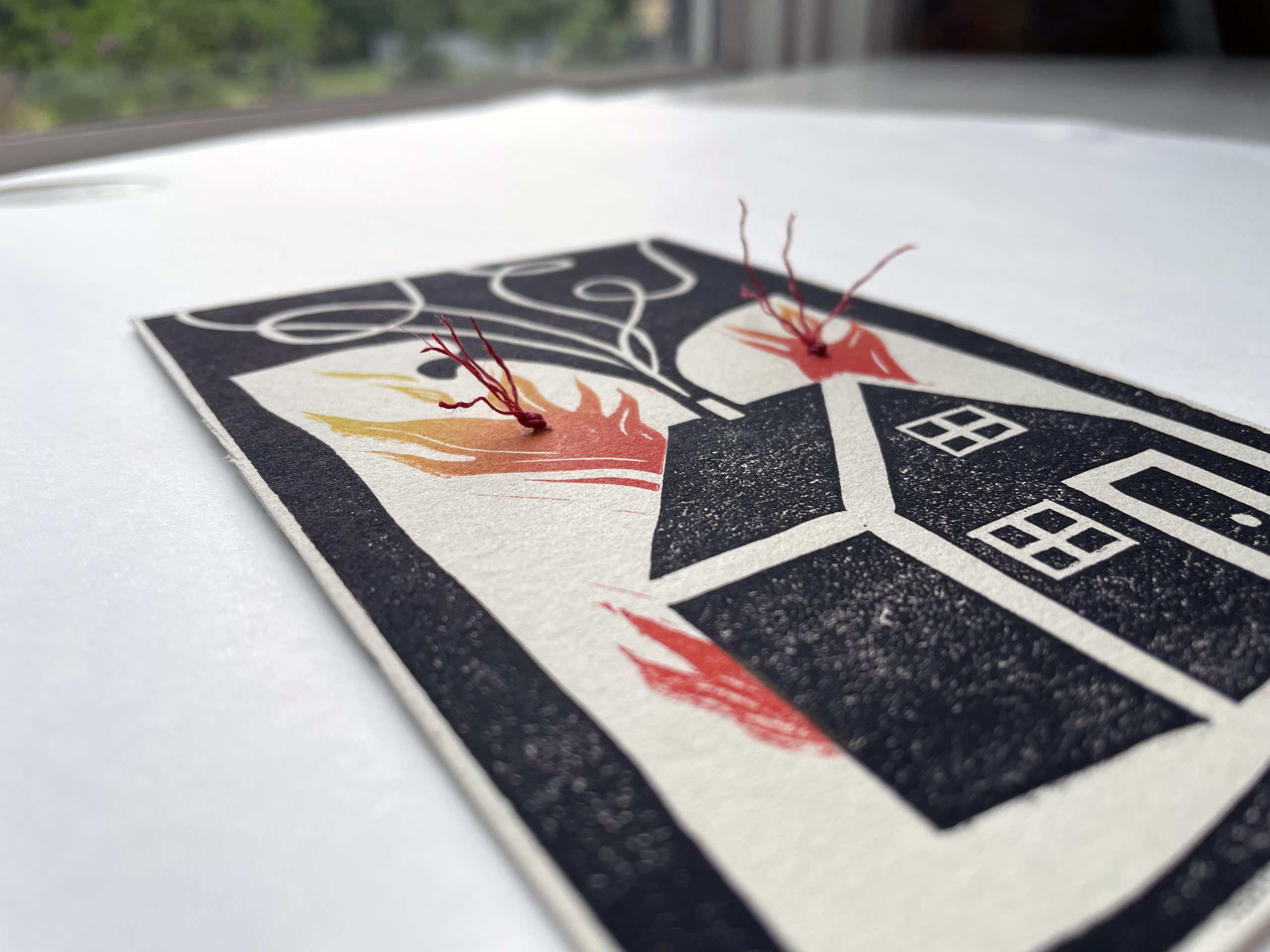 This is a book masquerading as a poetry broadside, with one side featuring a hand printed linocut of a house on fire. The flip side reveals a list poem about all the things we seem to be able to build instead of more housing. The red thread binding the book is unraveled on the outside, adding texture to the multi-colored flames. Flipping through the pages reveals the story of one renter’s struggle to find housing in a rural area of New York, the factors at play in the region, and how it feels to try to find home.