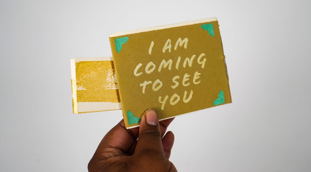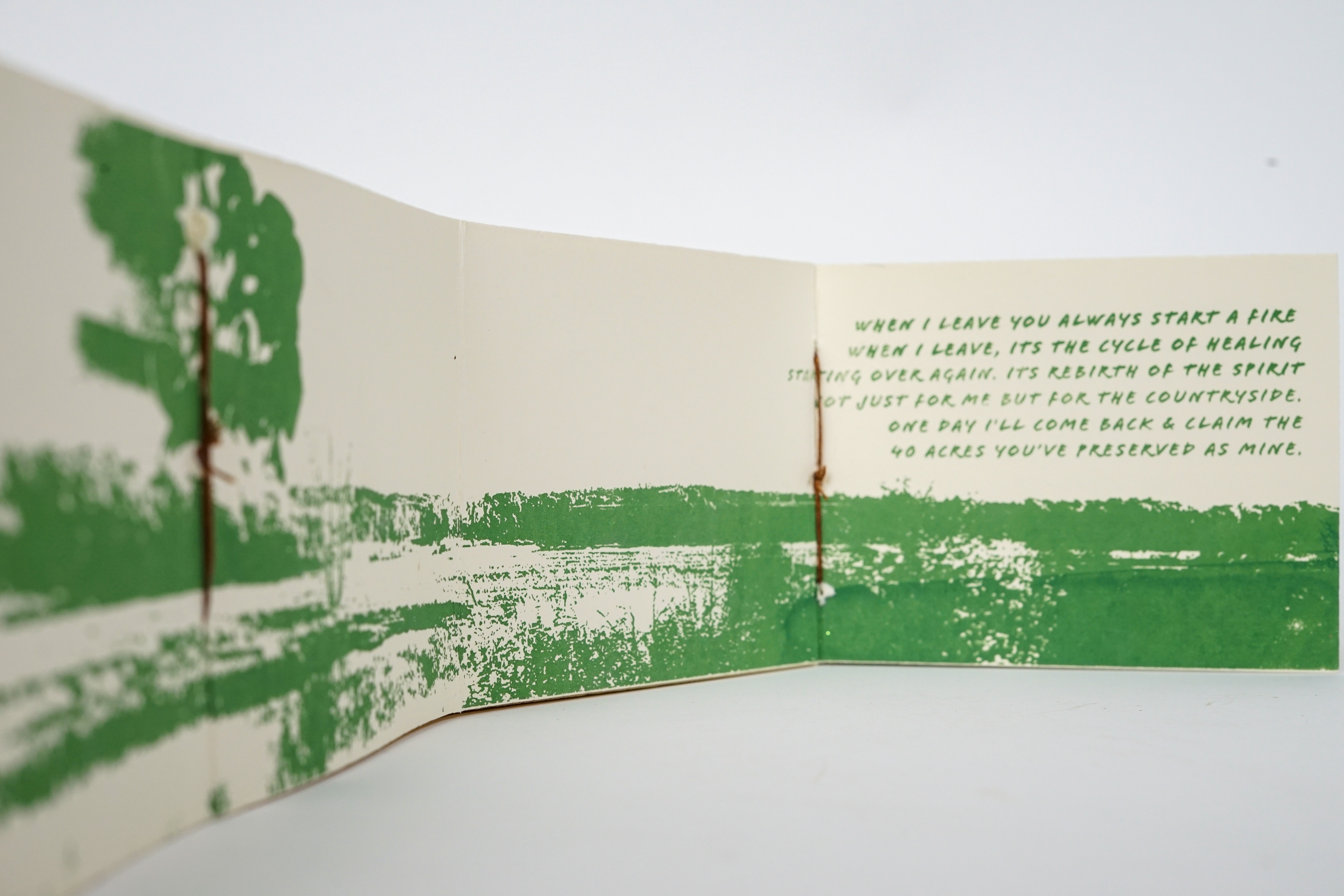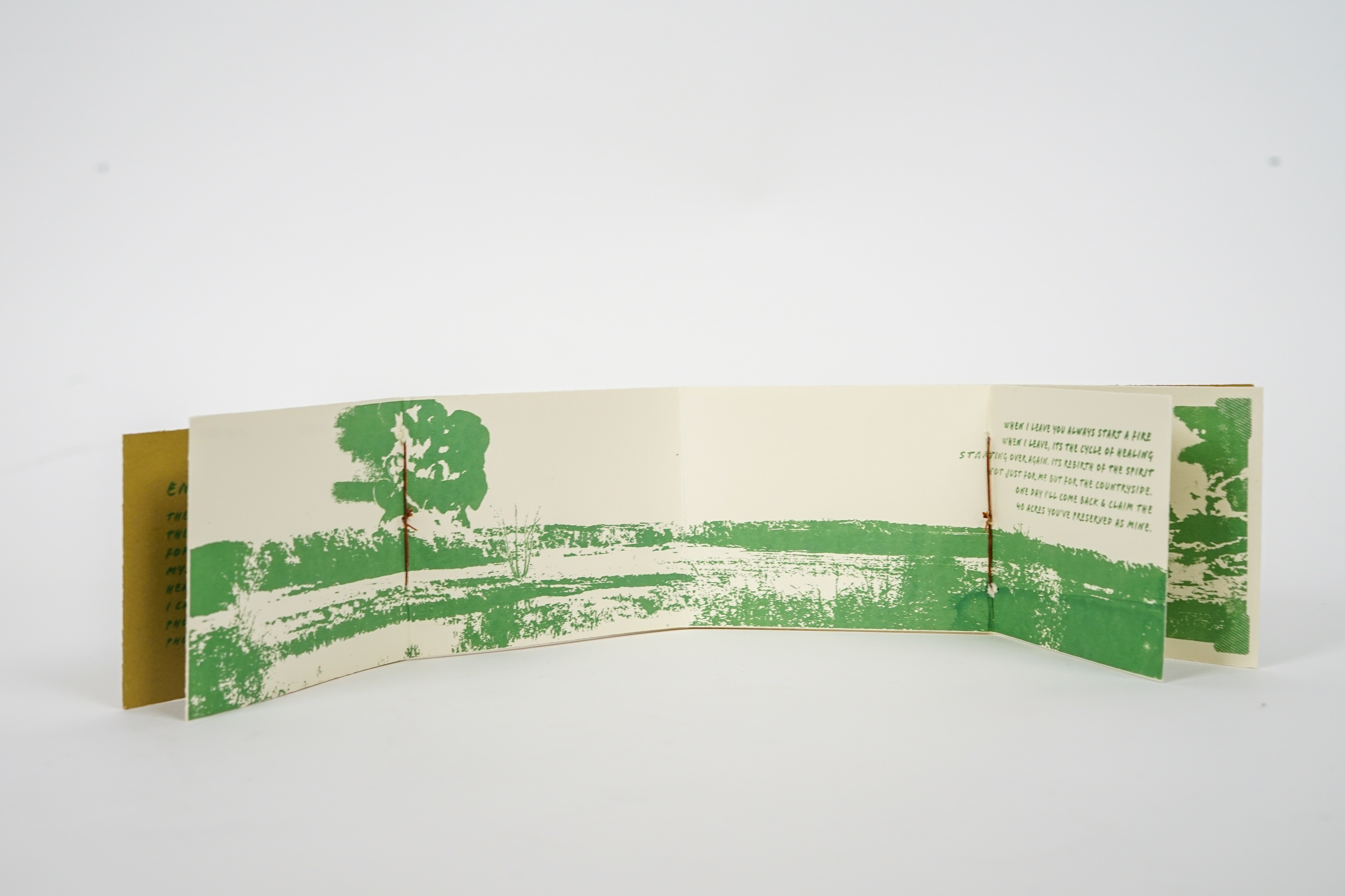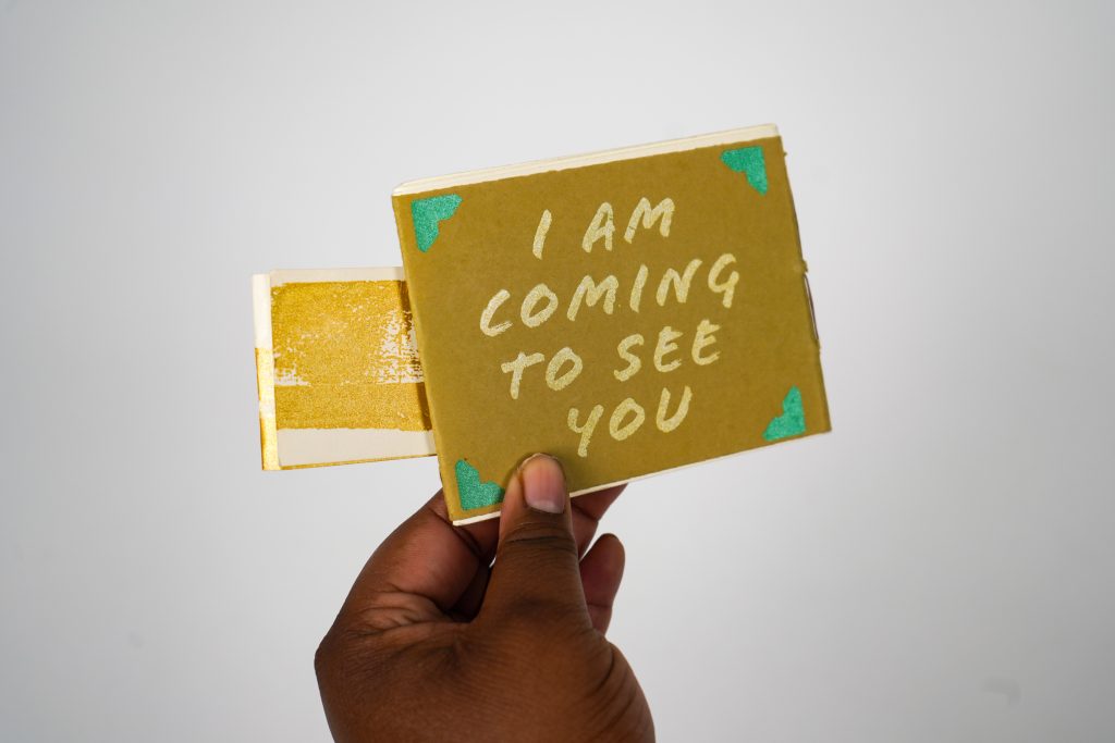 In I Am Coming To See You, a time-bending story is told about ancestral inheritances, love, and survival through time and space. In this newly created & unique book form, the audience is led to the center of the work by unfolding the pages back till the reader finds love, connection, and respect while simultaneously calling out the conditions within which that care must traverse. It is a book that tells, reflects, and is full of history while keeping your feet firmly planted in the present. The book form itself feels like unwrapping, pulling off layers of the city and society until we get to the expansive and open center of connection, nature, finding one’s self. This story is one of my Black identity, and my continuous desire to find and connect with my ancestors through nature, writing, and self-discovery. A feat that becomes harder and harder with the confinement & gentrification of the city and the bombardment of ads and technology clouding our thoughts. I Am Coming To See You is a story many people who look like me and the like can deeply relate to. A story of finding yourself as an African American and reconnecting with your loved ones. These 15 pages are devoted to exploring your ancestry, and to find an answer to who you are, you have to look back and talk to someone who has been historically silenced and hidden away from you.