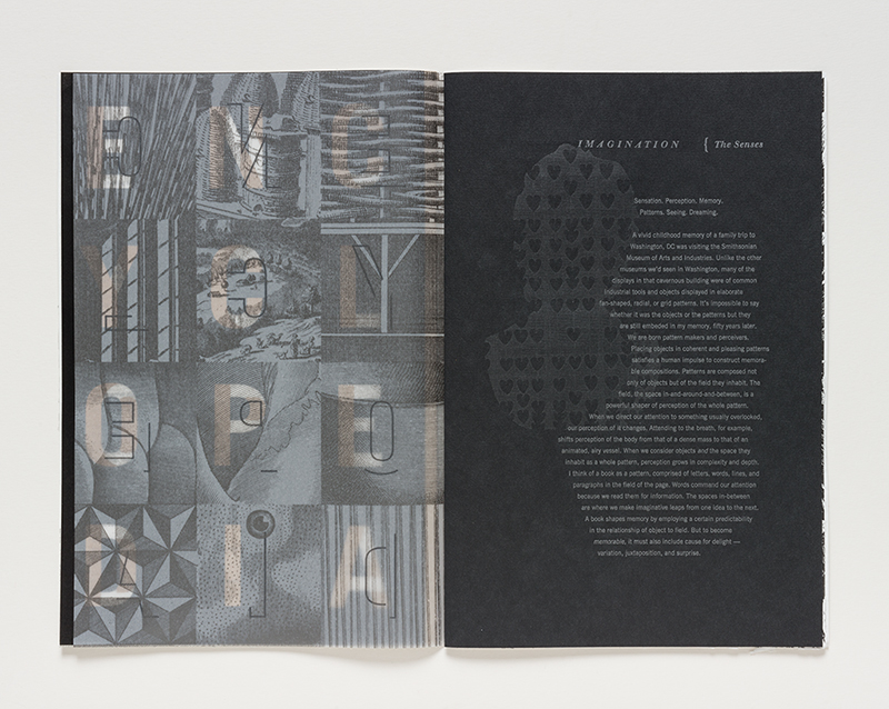 “I believe we make books in order to discover our subjects,” Botnick remarks in his artist statement for the winning work. Diderot Project was inspired by a five-year-long investigation of the “Encyclopédie ou dictionnaire raisonné des sciences, des arts et des métiers” — a 150-page visual and textual narrative; a meditation on the nature of craft, the hand, work, tools, machines, dreams, the senses and the imagination. The book is letterpress printed in five colors and incorporates six different papers, including handmade and watermarked paper made by Botnick at Dieu Donne paper studio in New York.