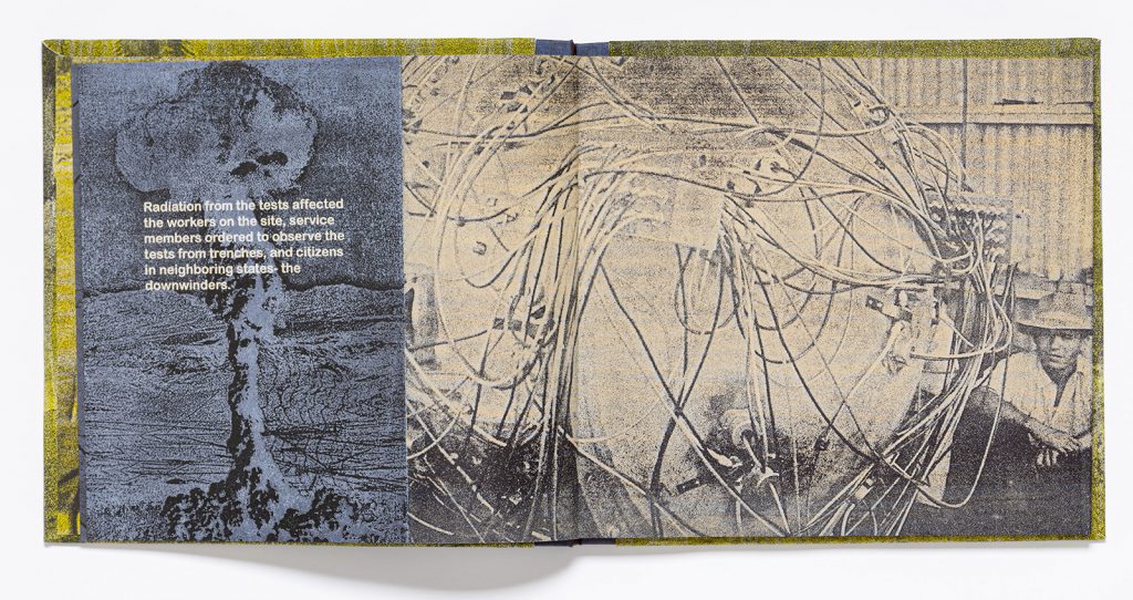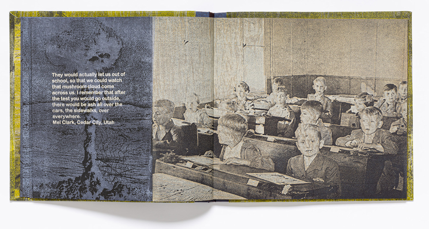 Testing: Book Two- Downwinders is the second in a series of three books about the effects of nuclear bomb tests in the American southwest. The series looks at veterans, miners, and citizens (downwinders) who experienced health effects from the nuclear test program. There were over 100 above ground tests between 1951 and 1963. The book combines archival photos with texts that give both statistics as well as personal stories about the legacy of these tests.