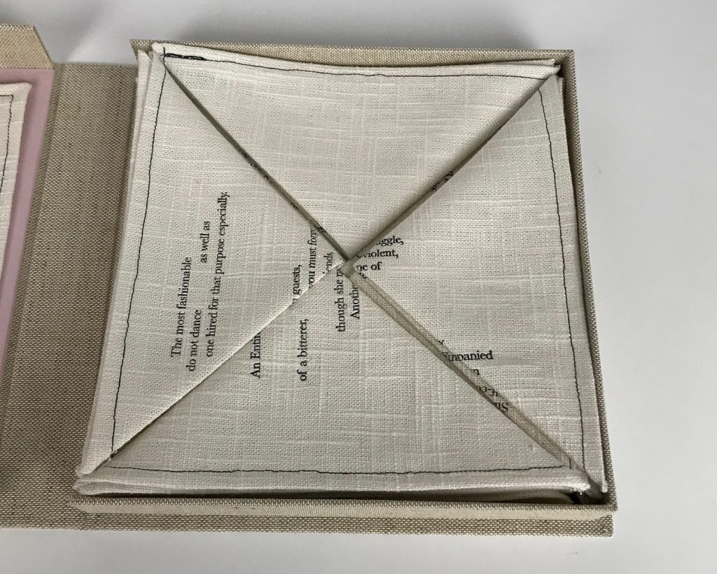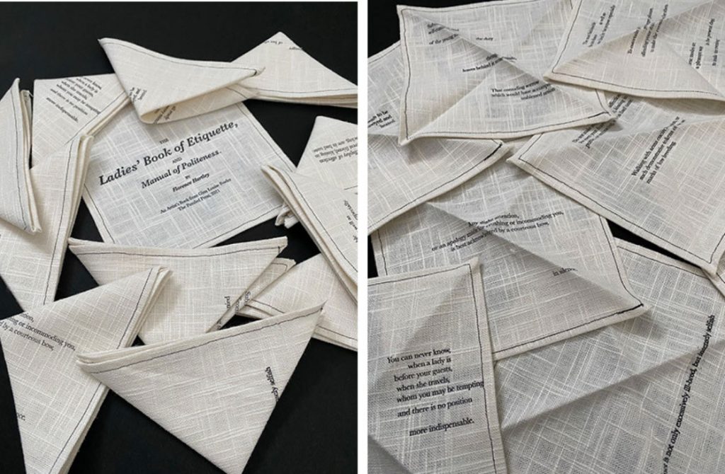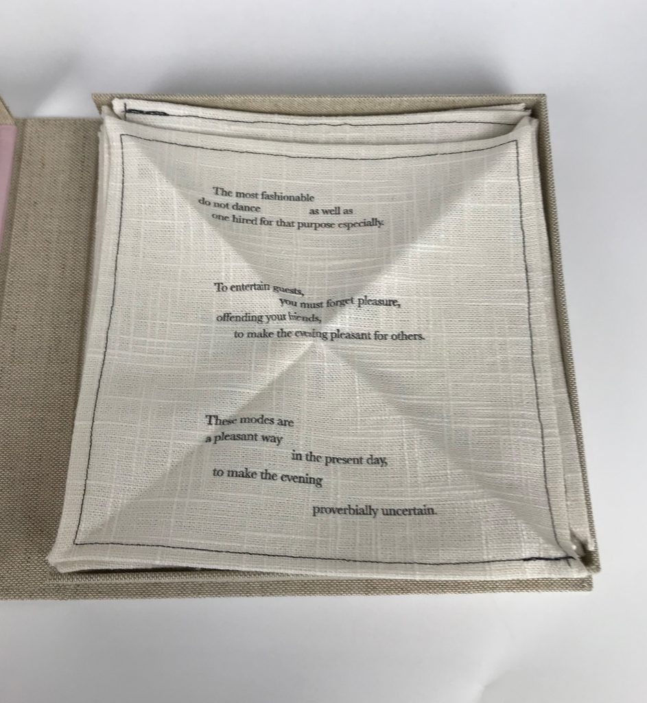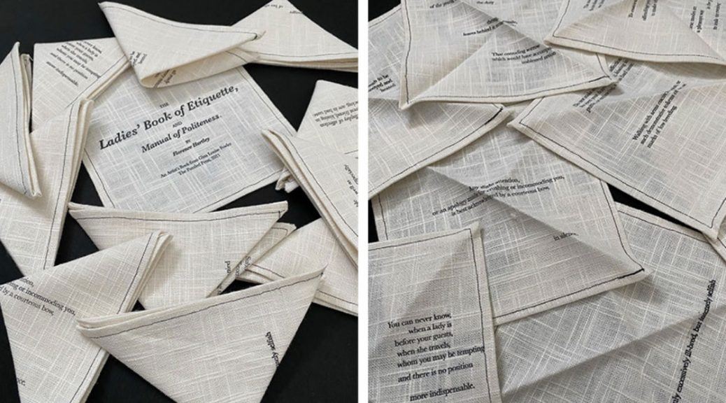 Housed in a clamshell box, The Ladies’ Book of Etiquette is made up of 12 individual, hand-sewn napkins. These napkins have been letterpress printed with content from an 1860 etiquette manual by