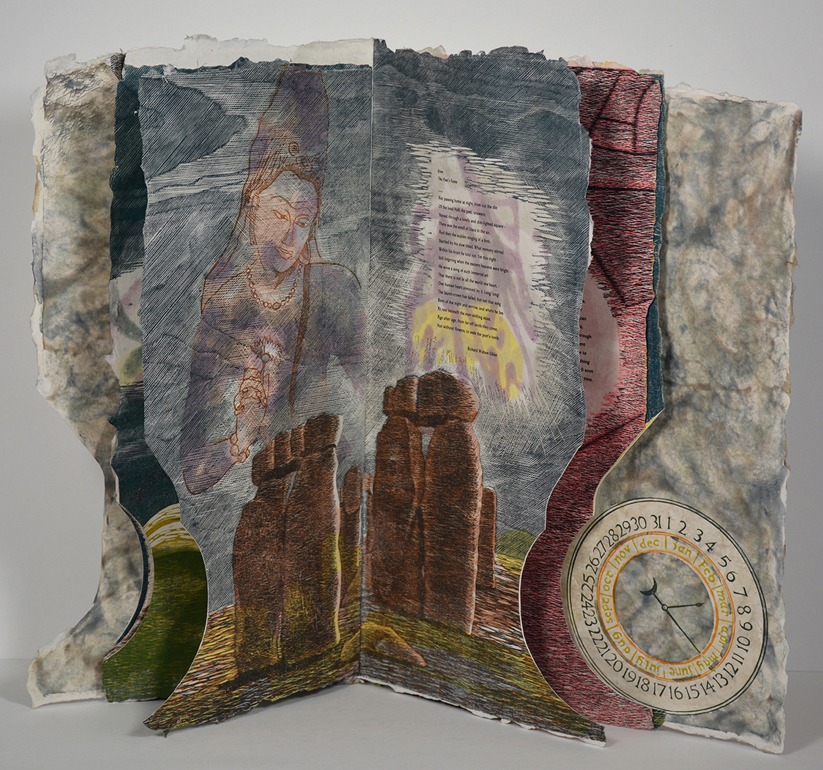 My artist book, Time, explores how we think about time, from the perspectives of art, religion, literature, and science. Time can be fleeting or eternal or elastic. It is unstable. When you try to pinpoint a moment of time, it has already gone. A similar thing happens when you try to pinpoint the meaning of time. You think you know what it is – then, like time itself, your idea of it escapes your grasp. Because it is difficult to conceptualize time as separate from life, we ordinarily think of time in terms of ourselves, our own lifetime, with a beginning and an end. While we are all subject to the inevitability of time’s ravages, some people have tried to control time by creating great works that are to last long after their lifetimes. Time appears to be constantly moving in one direction, from past to present to future, so we try to make it concrete by creating ways of measuring it – with the sun and moon, with clocks and calendars. We read sundials by the shadows they create, and we speak of the longer shadows of time. In Hinduism time is not linear, but is cyclical and considered to be a necessary condition of all growth and decay. The blossoms of spring become the barren trees of winter; spring returns. Time is also seen as a manifestation of God. In order to illustrate the different perspectives of time, I have chosen texts from the writings of Shakespeare, Tagore, Einstein, Thoreau, Hawking, and others.