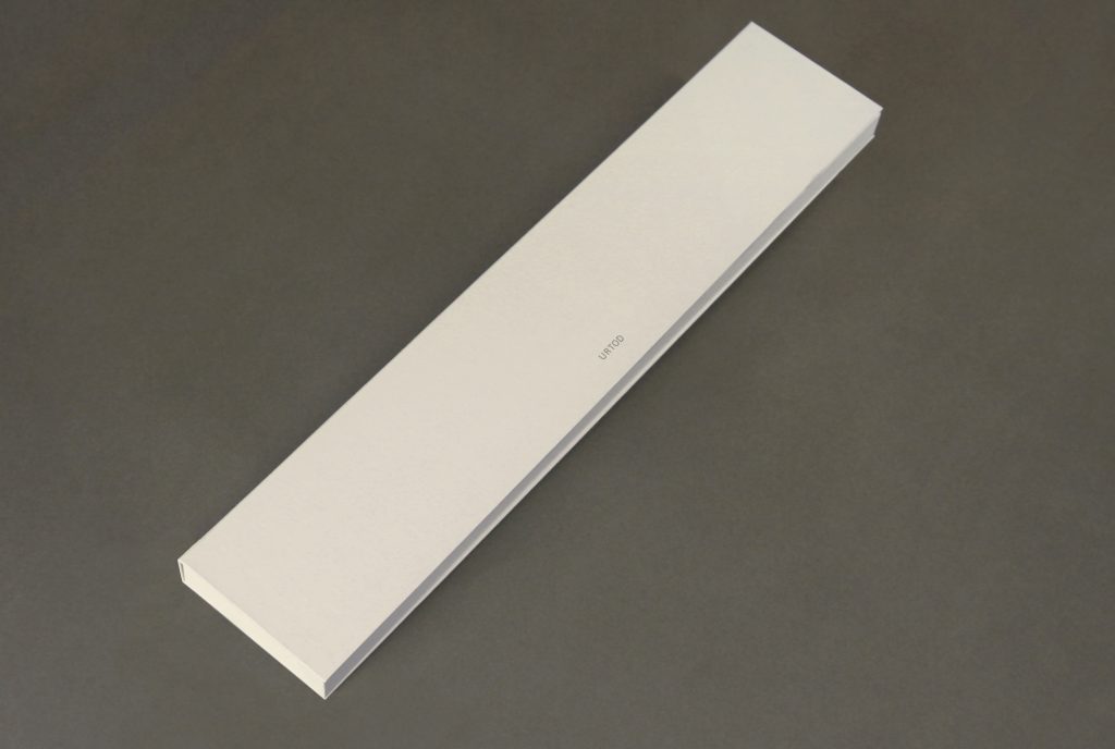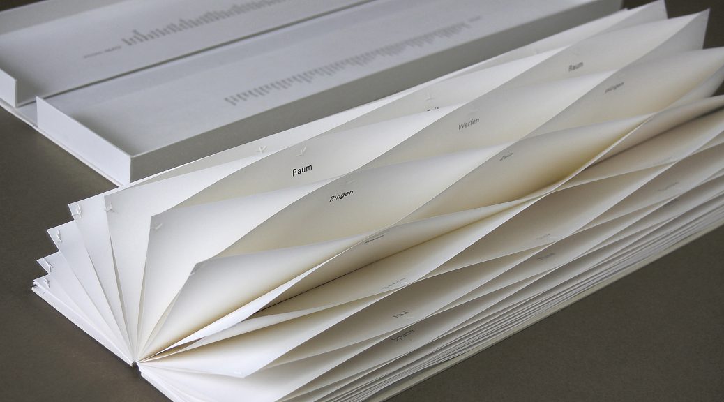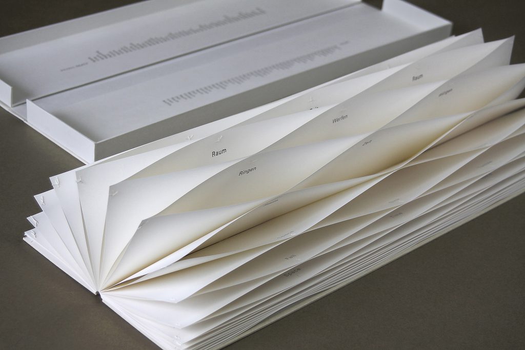 The unusually narrow portrait format of the box visually follows August Stramm’s Urtod and thus seems to be the perfect habitat for the poem. Its line length never exceeds that of a word, so it seems to grow slenderly in height. However, once the book inside is opened, a fan-like book space is revealed, the pages of which are interlinked and which want to be viewed in a landscape Format. All of a sudden, the small spaces are revealed, each containing a single word component of the poem. It is an invitation to the viewer to follow the reading direction suggested by the book structure.